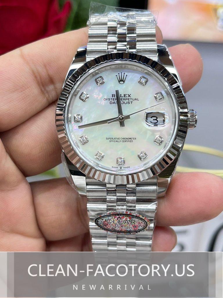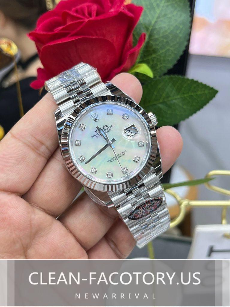Hello everyone, I’m the Clean Factory official reviewer, and today, I’ll be giving you a closer look at the Rolex Datejust 41mm with a mother-of-pearl dial and moissanite diamond markers, produced by Clean Factory. In this review, we’ll explore the craftsmanship, the dial, and the movement that make this watch truly special.