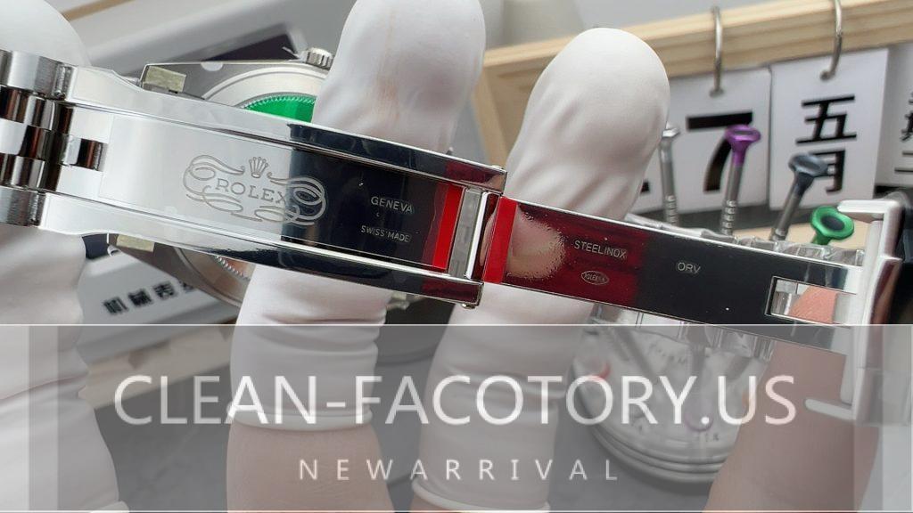 Clean Factory continues to use true 904L stainless steel for both case and bracelet—an industry benchmark. The fluted bezel is wrapped in 18k white gold, maintaining both luster and durability. The case features a screw-down crown with the Twinlock double waterproofness system and a sealed case back, achieving the same 100m water resistance as the authentic model.