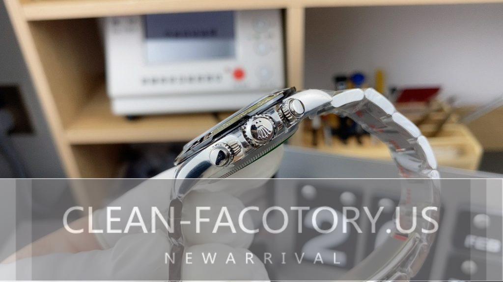 Clean Factory has meticulously crafted this Daytona replica, paying close attention to the polishing and detailing of the 904L stainless steel case, which boasts a radiant finish and a smooth, refined touch. The dial, adorned with hand-painted finishes and high-quality luminous material on the hands, ensures legibility in any lighting condition. The dimensional inlay technique used on the dial markers adds depth and character to the watch face, showcasing Clean Factory’s commitment to excellence in design.