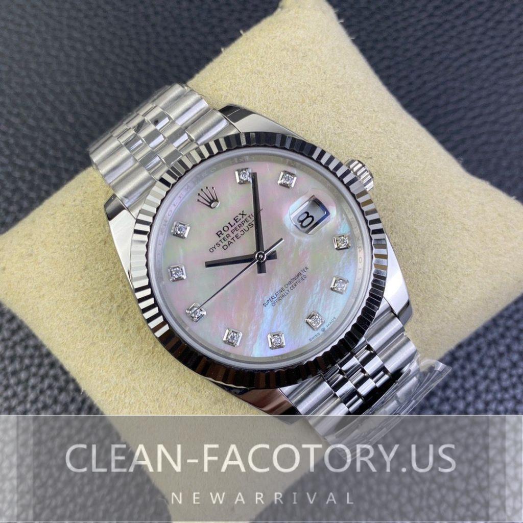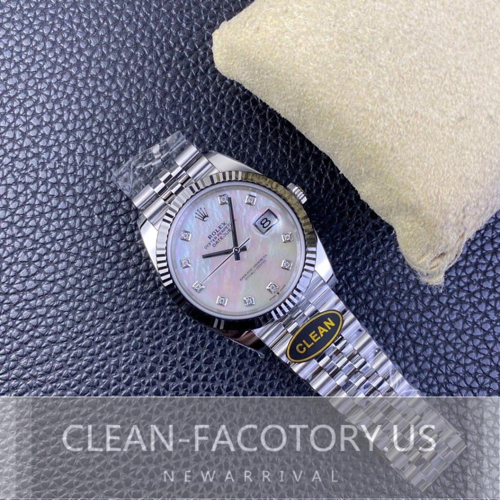 Conclusion: The Clean Factory Rolex Datejust 41mm Jubilee with mother of pearl dial and diamond markers represents the pinnacle of replica watch craftsmanship. It combines the classic allure of Rolex with modern manufacturing precision, resulting in a timepiece that offers unmatched elegance and functionality. For enthusiasts and collectors alike, this replica is a testament to the possibility of owning a piece of luxury without compromising on quality. If you appreciate fine watches, this Clean Factory replica is undoubtedly worth considering for its remarkable attention to detail and fidelity to the original Rolex design.