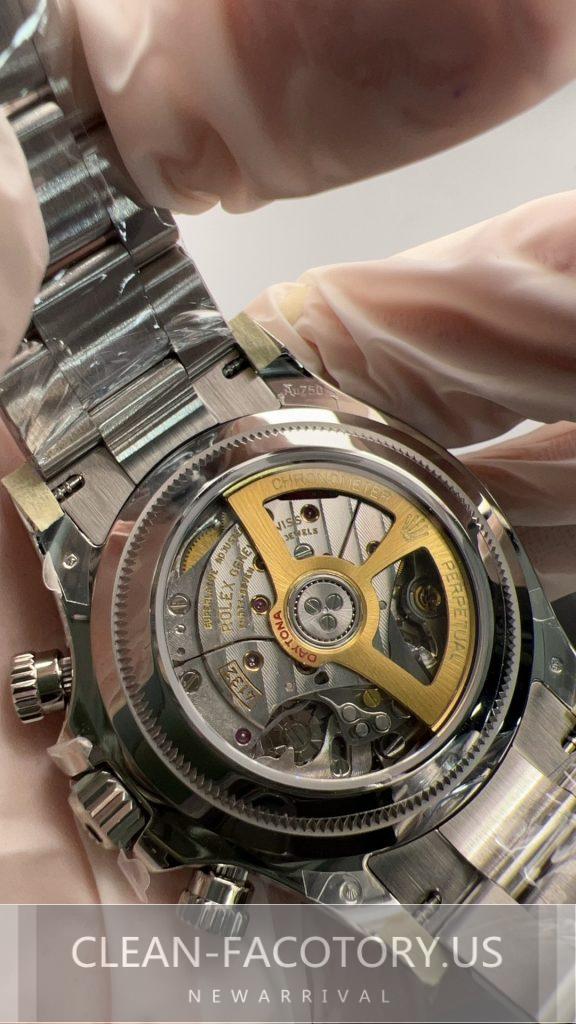 Another notable change is the sapphire crystal case back, first seen in the platinum Daytona model from March. Clean Factory has ensured this transparent case back is included, giving watch lovers a chance to admire the inner workings of the new 4132 caliber—a feature rarely seen in traditional Rolex designs. The sapphire exhibition case back adds a contemporary twist while still maintaining the Daytona’s signature allure.