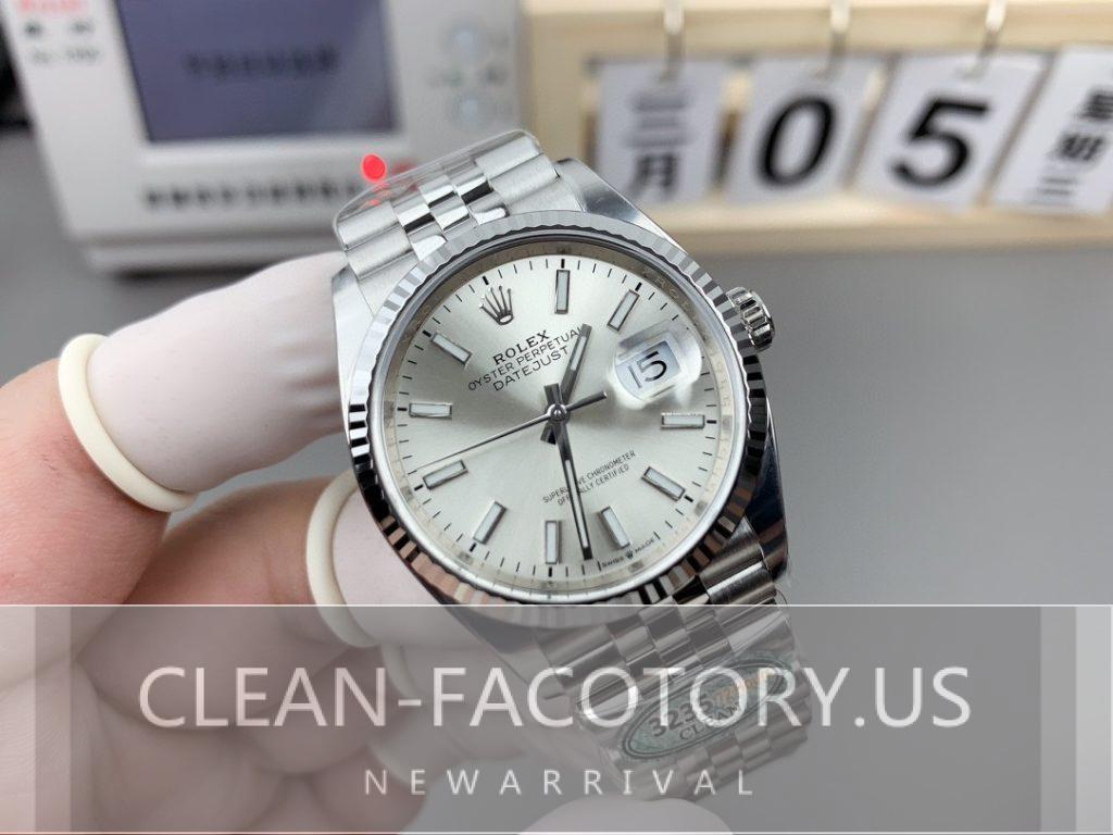 From a replica perspective, the Silver dial is the hardest to execute well. Color neutrality is notoriously difficult. A single step too warm and it becomes beige. A step too cool and it becomes grey. Clean Factory’s current generation captures the correct middle tone—the hue that shifts rather than stays locked—and the sunburst grain is tight enough that the dial does not sparkle aggressively. The applied indices sit proudly above the surface, and the contrast remains legible even at oblique angles.