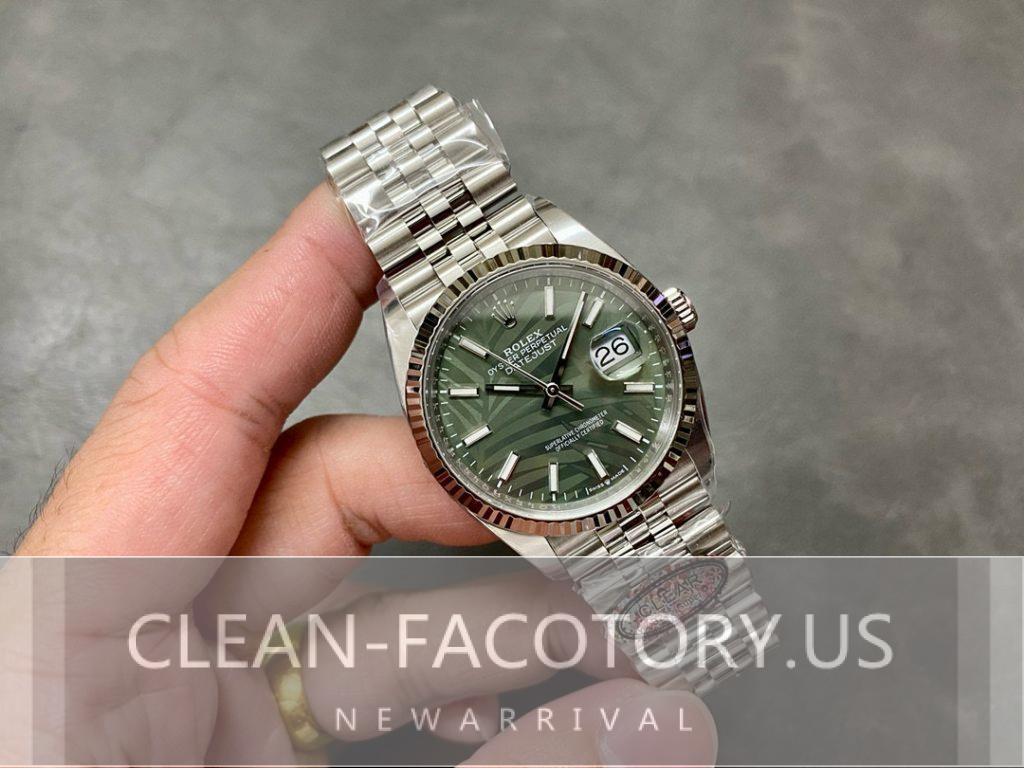 Excitingly, Clean Factory will soon release a variant of the Datejust featuring a stunning Palm Leaf dial with a diamond green face. This new design is one of the most eagerly awaited releases in the replica market. The intricate Palm Leaf design, combined with diamond accents, adds elegance and sophistication. Additionally, the green color adds a bold twist, making it an excellent choice for collectors looking for something unique. Therefore, this release promises to be an exceptional addition to Clean Factory’s collection.