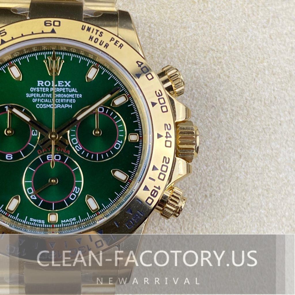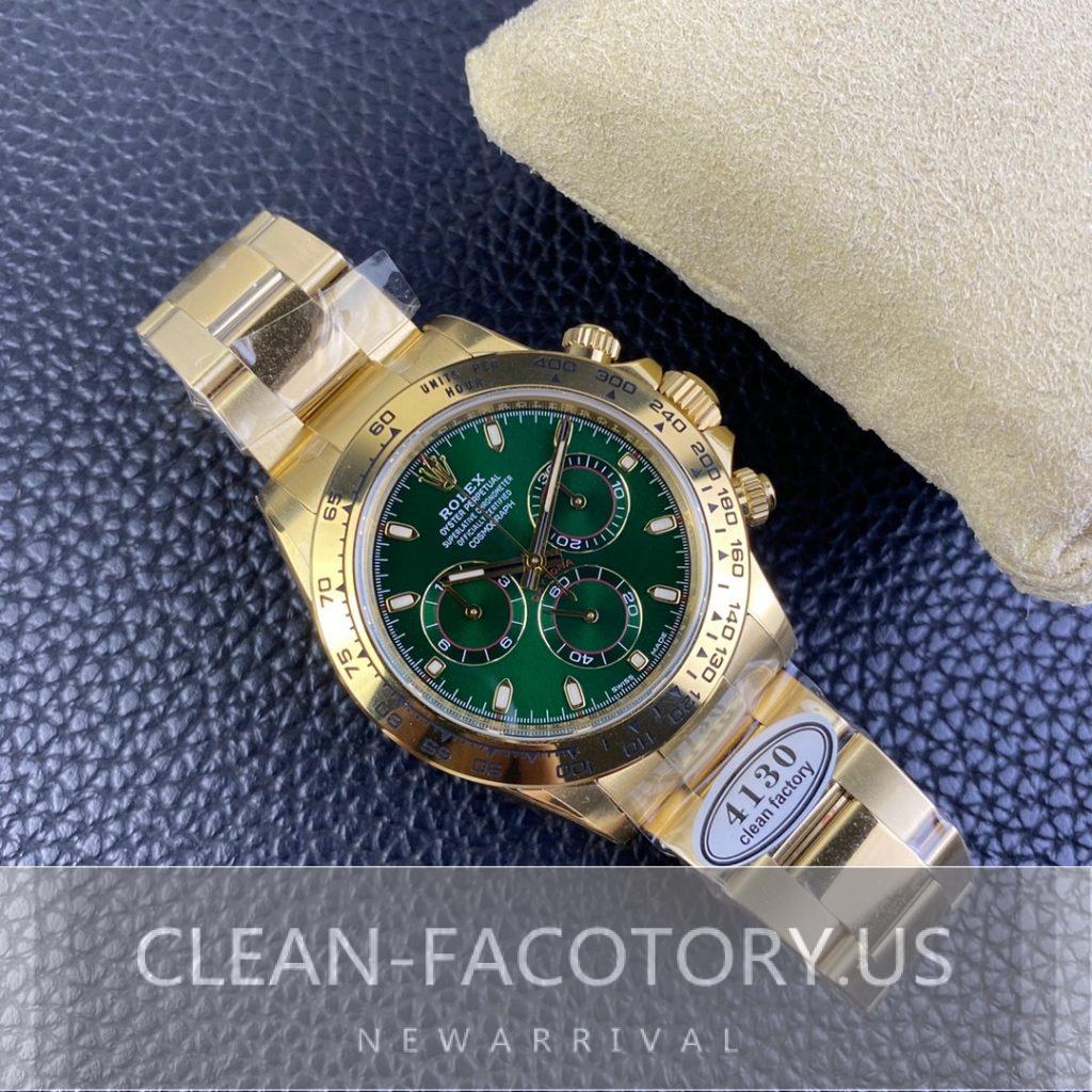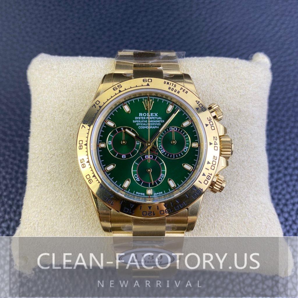 Internally, the precision of the engraved numerals and letters is striking, with Clean Factory demonstrating a keen eye for detail across the board. The “John Mayer” edition’s green dial is impeccably replicated, providing a vibrant backdrop that contrasts beautifully with the gold wrapping. This feature is a hallmark of the “Green Gold” Daytona, perfectly captured in this replica.