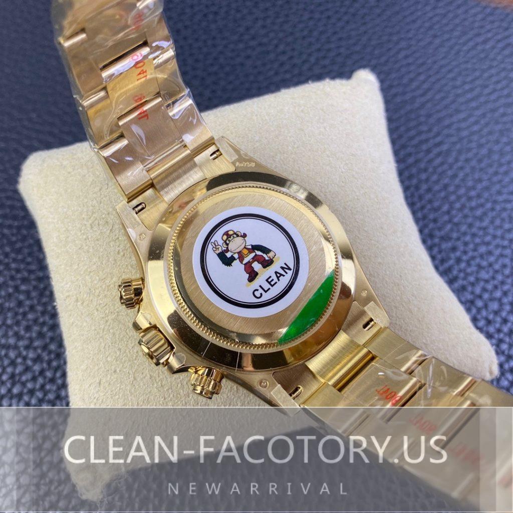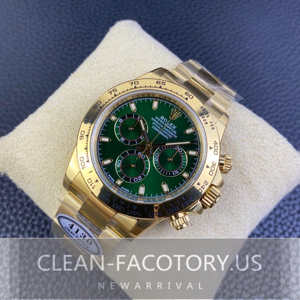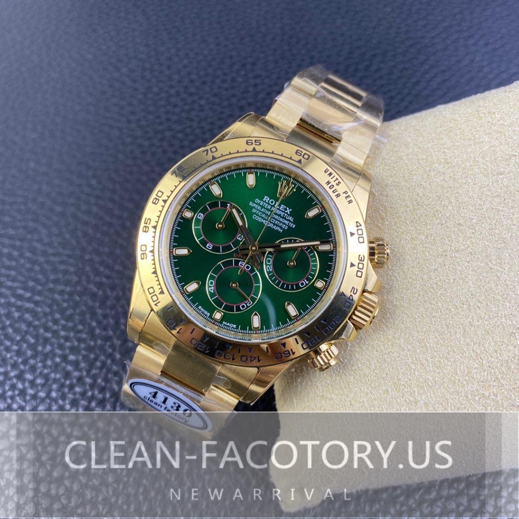 Internally, the precision of the engraved numerals and letters is striking, with Clean Factory demonstrating a keen eye for detail across the board. The “John Mayer” edition’s green dial is impeccably replicated, providing a vibrant backdrop that contrasts beautifully with the gold wrapping. This feature is a hallmark of the “Green Gold” Daytona, perfectly captured in this replica.