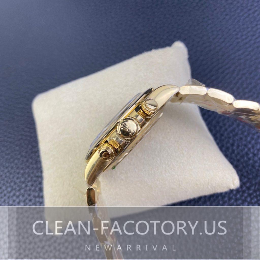 This particular Clean Factory Rolex Daytona “John Mayer” replica is crafted from 904L stainless steel and undergoes an intricate gold wrapping process, closely mimicking the original’s 18k yellow gold appearance. Despite the material differences from the genuine piece, the replica’s gold plating technique ensures a lasting finish, resistant to the common pitfalls of discoloration. Sized at 40mm in diameter and 12.2mm in thickness, thanks to the 4130 movement integration, the watch comfortably suits both male and female wrists. It offers an authentic wearing experience nearly identical to the original, thanks to accurate dimensionality and design synchronicity.