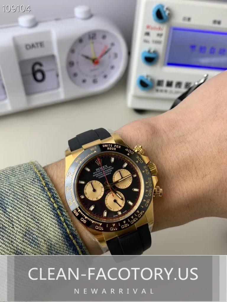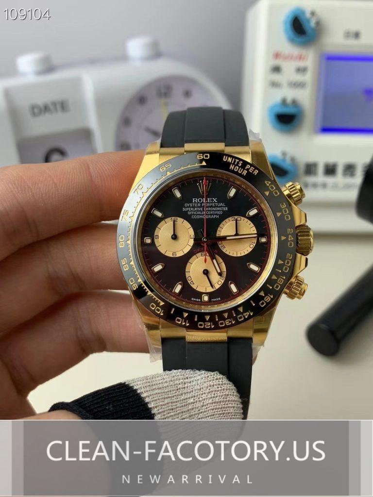 Hello everyone, today I’m introducing the Clean Factory Rolex Daytona 116518LN Black Dial, Red Chronograph Hand, Rubber Strap, Cerachrom Bezel, Yellow Gold Wrapped 904L Steel, Best Edition 4130 Movement, also known as the “Little Devil” or “Devil’s Eye.” This model is one of the key pieces in the Daytona series, and many people are fond of this particular color combination. While multiple factories have produced this watch, the differences in detail are quite noticeable. Let’s take a closer look at the craftsmanship of this Clean Factory “Little Devil” Daytona.