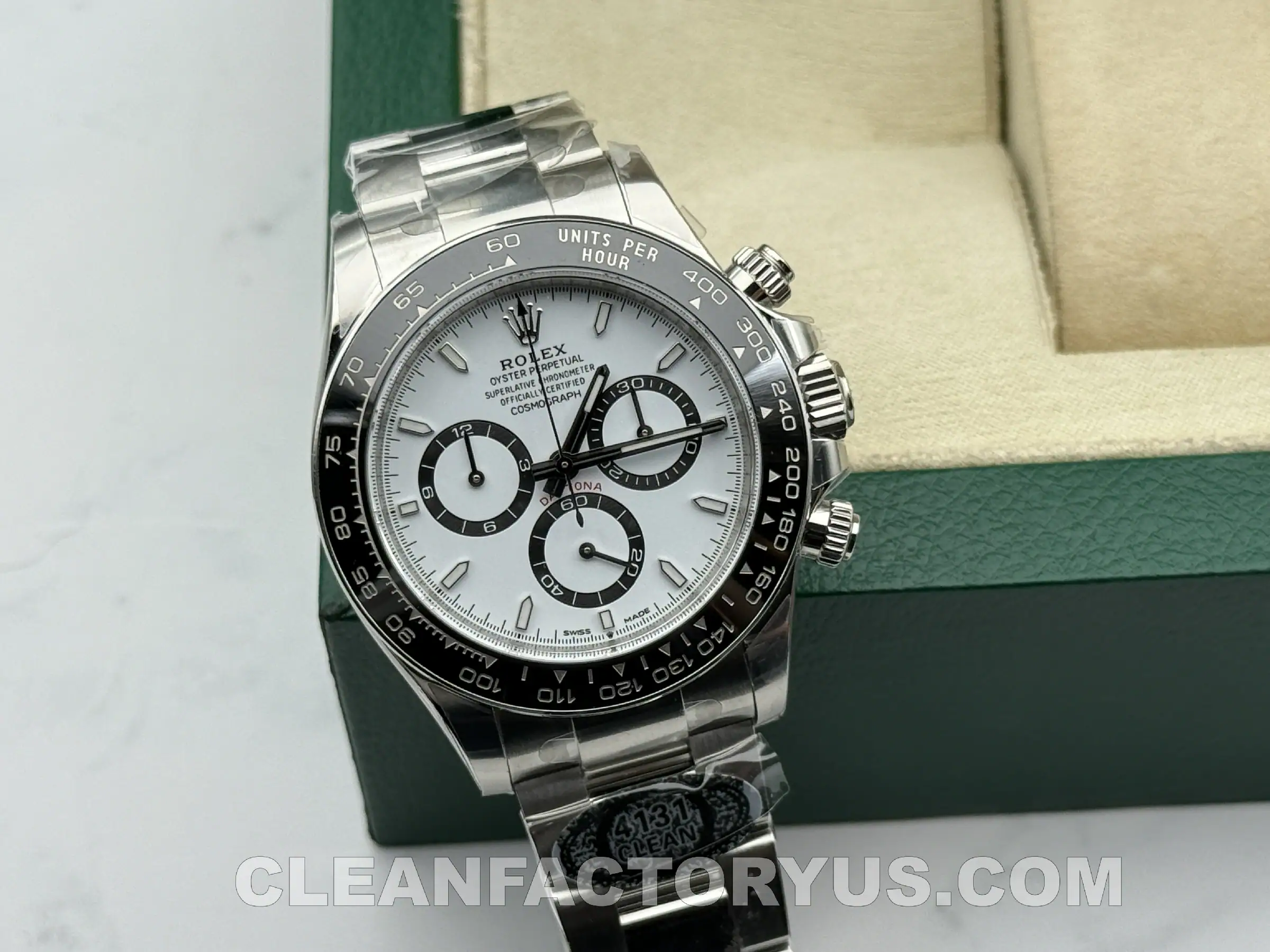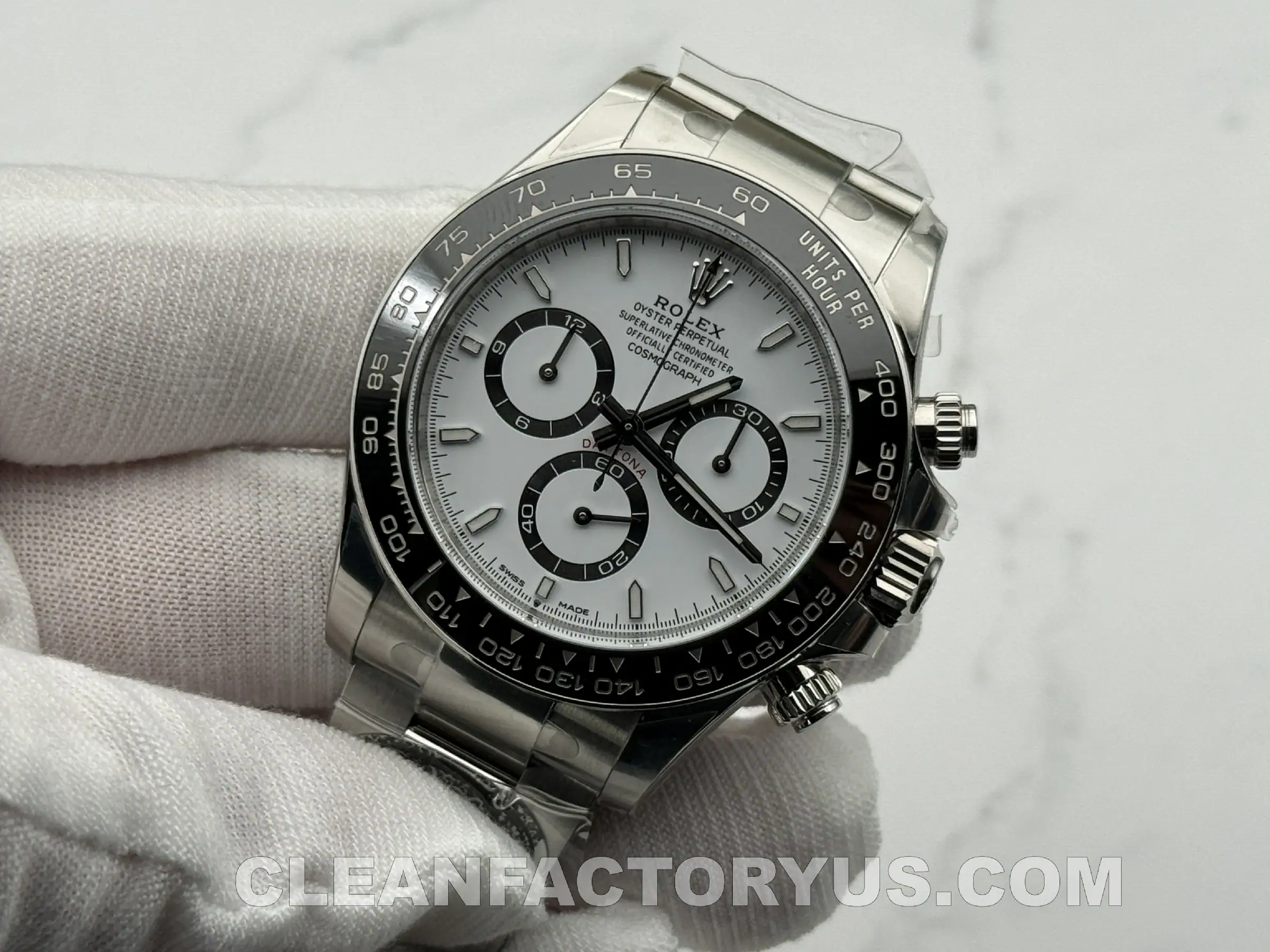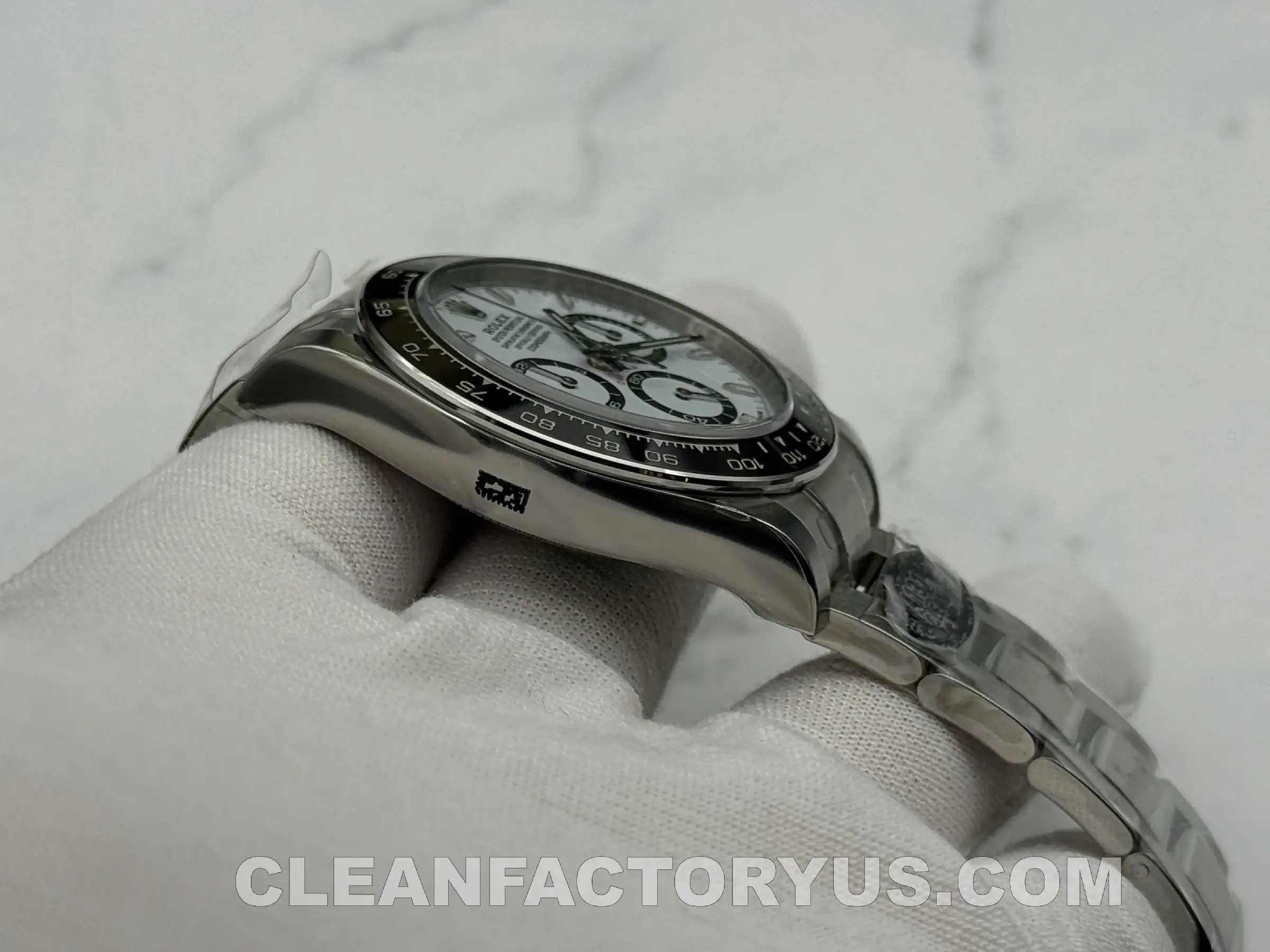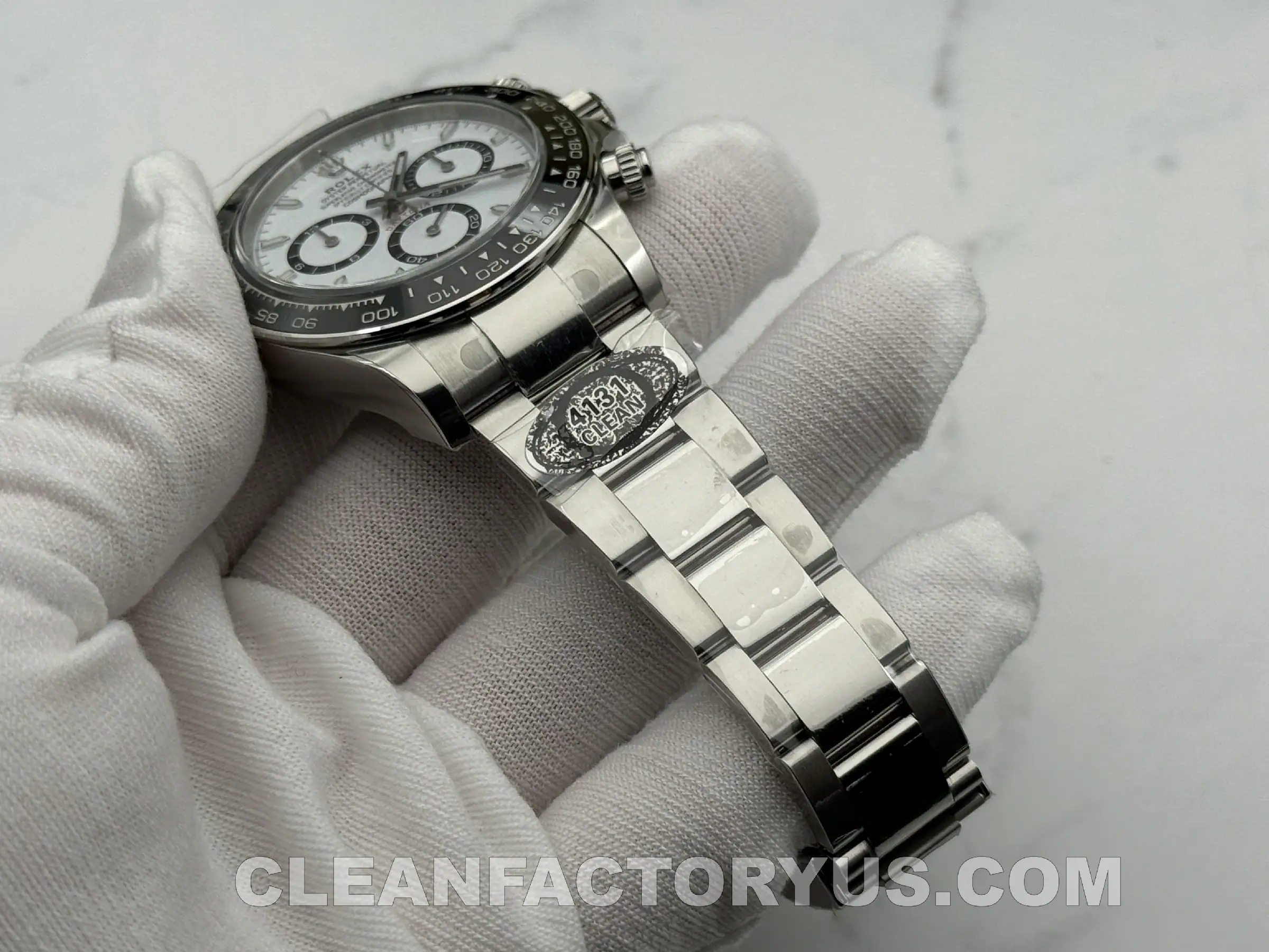 But the gap is no longer in the broad identity of the watch. From normal viewing distance, the Clean Factory version captures most of what people respond to in the modern white-dial Daytona: the contrast, the ceramic framing, the compact case, and the calm visual tension that makes the design work in the first place.