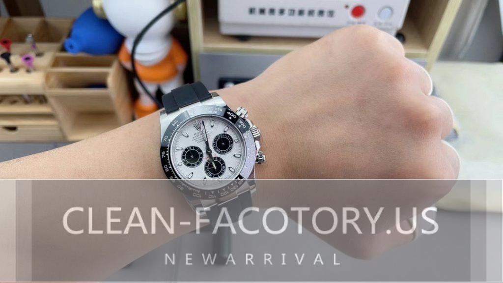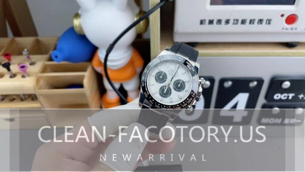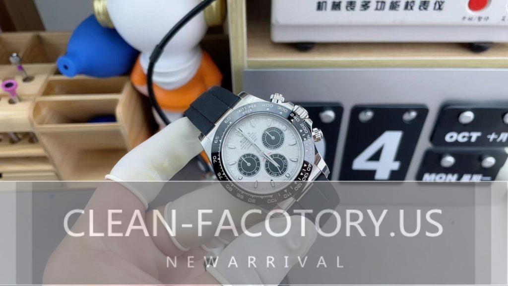 This Clean Factory model closely matches the original Daytona design. It features a 40mm case and a thickness of 12.4mm. However, the platinum components are made from electroplated stainless steel rather than actual platinum. This reduces production costs but still achieves a similar visual appearance. The dial and hands maintain the classic look of the original.