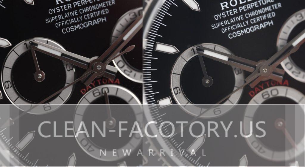 Other aspects like the hour markers and luminescence are also well-crafted. It’s worth noting that genuine 4131 models have transitioned to cylindrical pointer tips, but the four genuine pieces provided by Clean revealed some inconsistencies, such as variations in the hour markers’ roundness and the use of older conical pointer tips, suggesting Rolex might be clearing out 4130 inventory.