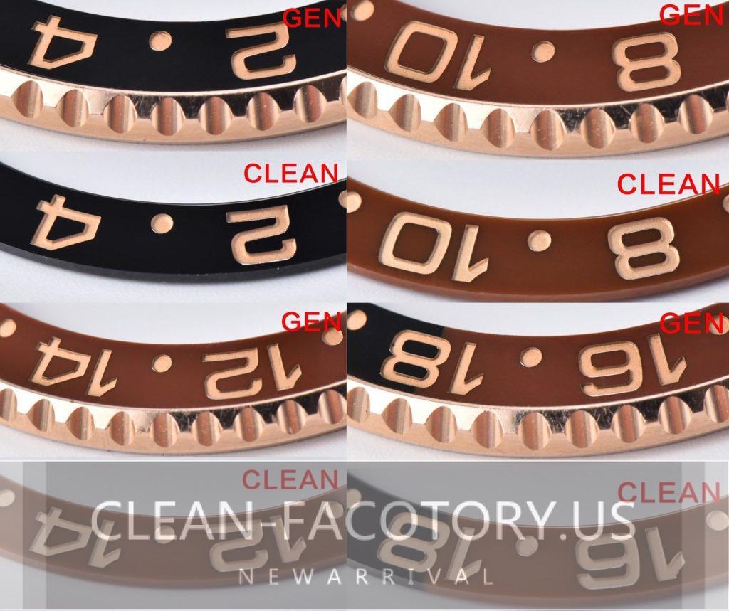 Visual Analysis of Clean Factory’s Root Beer Bezel: As shown in the images, there’s zero color deviation in the black section, and the brown portion is nearly identical, eliminating any suspicion of color manipulation. Authentic watch owners can verify this by comparing with the actual watch. The depth and shape of the numerals, as well as the rose gold electroplating, are impressively accurate. In the lower right image, the intersection of the two colors on Clean Factory’s ceramic bezel is seamless, crafted as a single piece rather than a composite. Achieving this effect required countless attempts due to the complexities of dual-color ceramic firing.