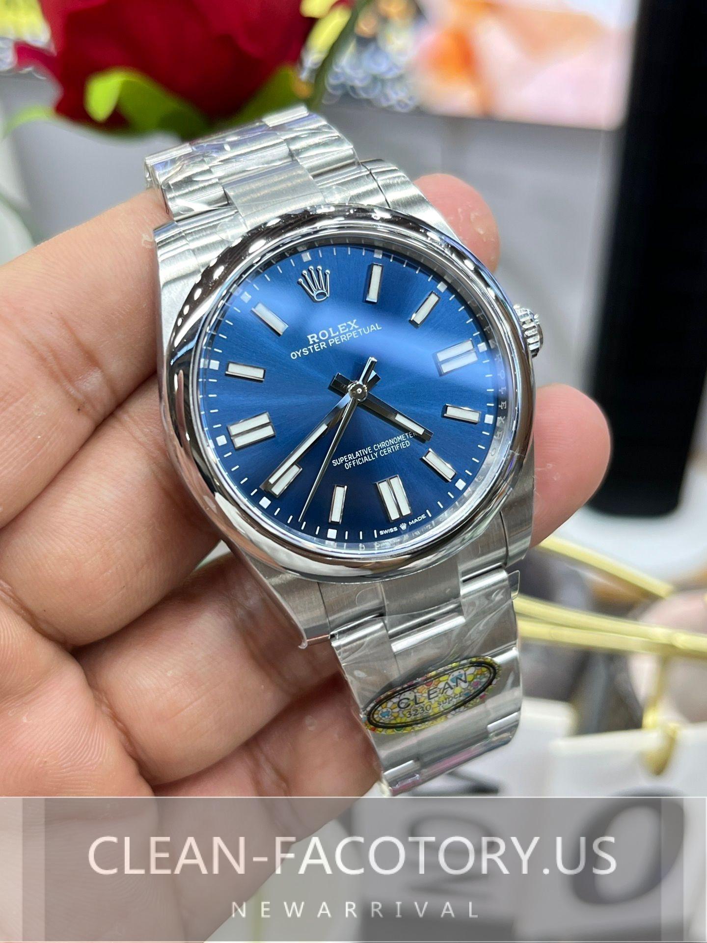 Clean Factory presents the Rolex Oyster Perpetual in both 41mm and 36mm sizes, catering to a wide range of wearers while gradually introducing more color options, including the increasingly popular Tiffany Blue. The availability of these sizes provides detailed benefits to enthusiasts from all walks of life. The watch’s case, crystal, sides, and back are meticulously crafted, reflecting exceptional quality. The case is made from premium 904L stainless steel, polished and brushed to exude an elegant sheen. The crystal is crafted from sapphire, offering high transparency and scratch resistance. The sides match the case in 904L stainless steel with a brushed finish, while the back features the Oyster design, impressively detailed throughout.