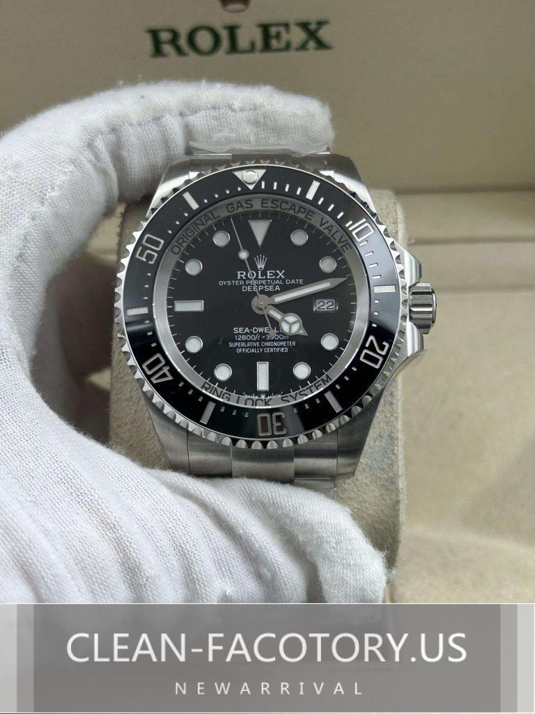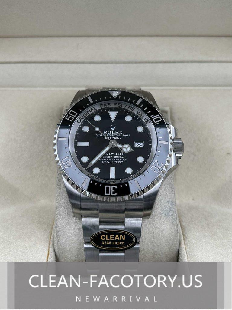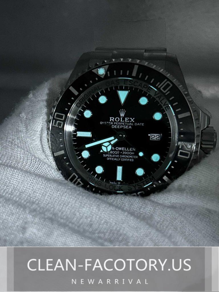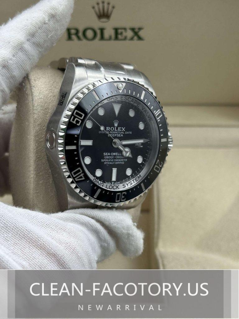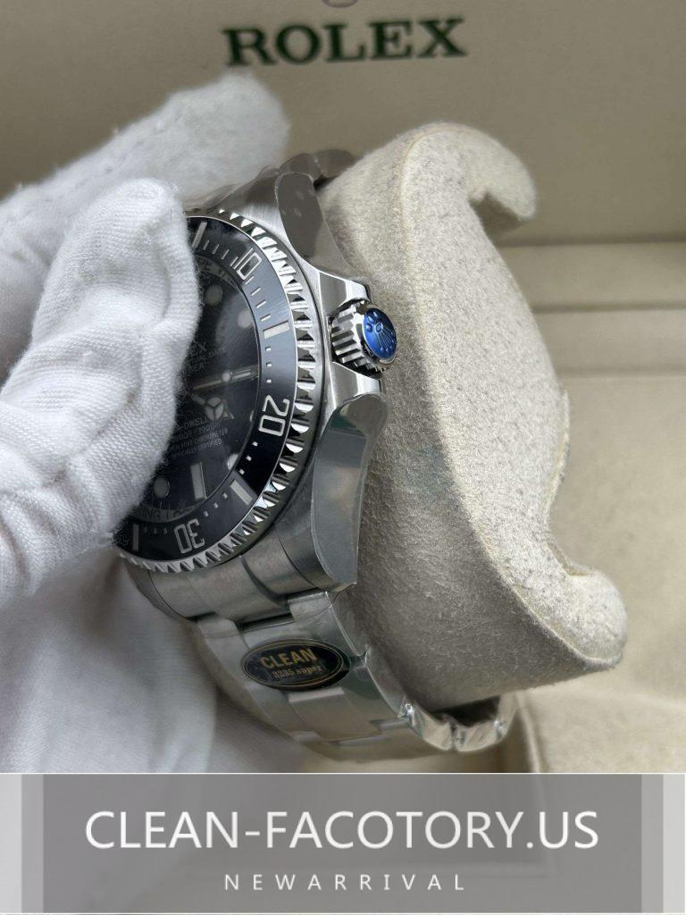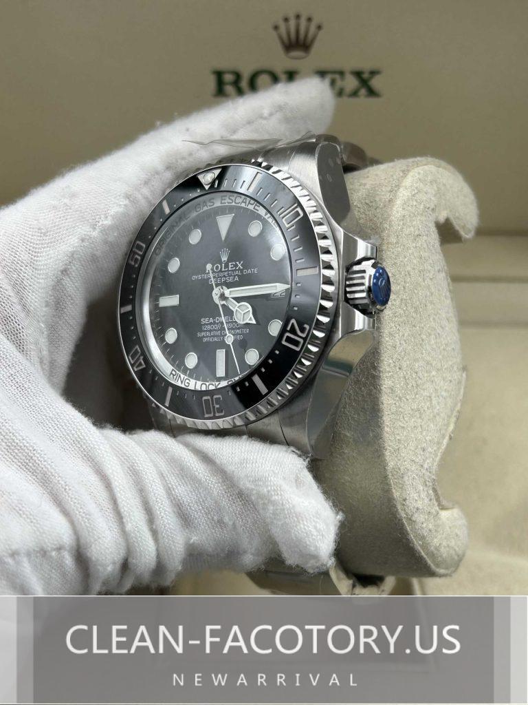 Clean Factory proudly introduces its Rolex Sea-Dweller Deepsea 126660 series, highlighted by a state-of-the-art integrated 3235 movement. This masterpiece is a testament to the brand’s commitment to precision and quality, replicated directly from original designs to achieve a flawless 1:1 accuracy in every detail. The bezel’s luminescent pearl utilizes a genuine stamping method, forsaking the traditional use of adhesive and resolving the issue of detachment. The ceramic bezel is crafted using the most advanced original stamping technology to replicate the original’s internal structure accurately, ensuring the bezel’s rotation sound and resistance are identical to the genuine model. The ceramic bezel is adorned with an authentic white gold plating process for lasting durability and intricate detail that rivals the original.