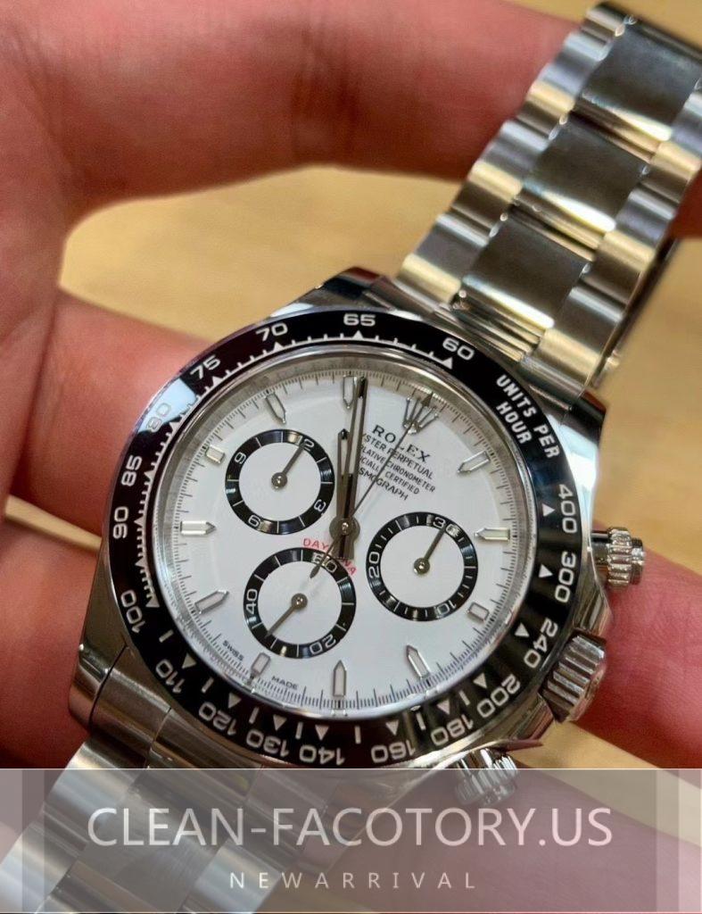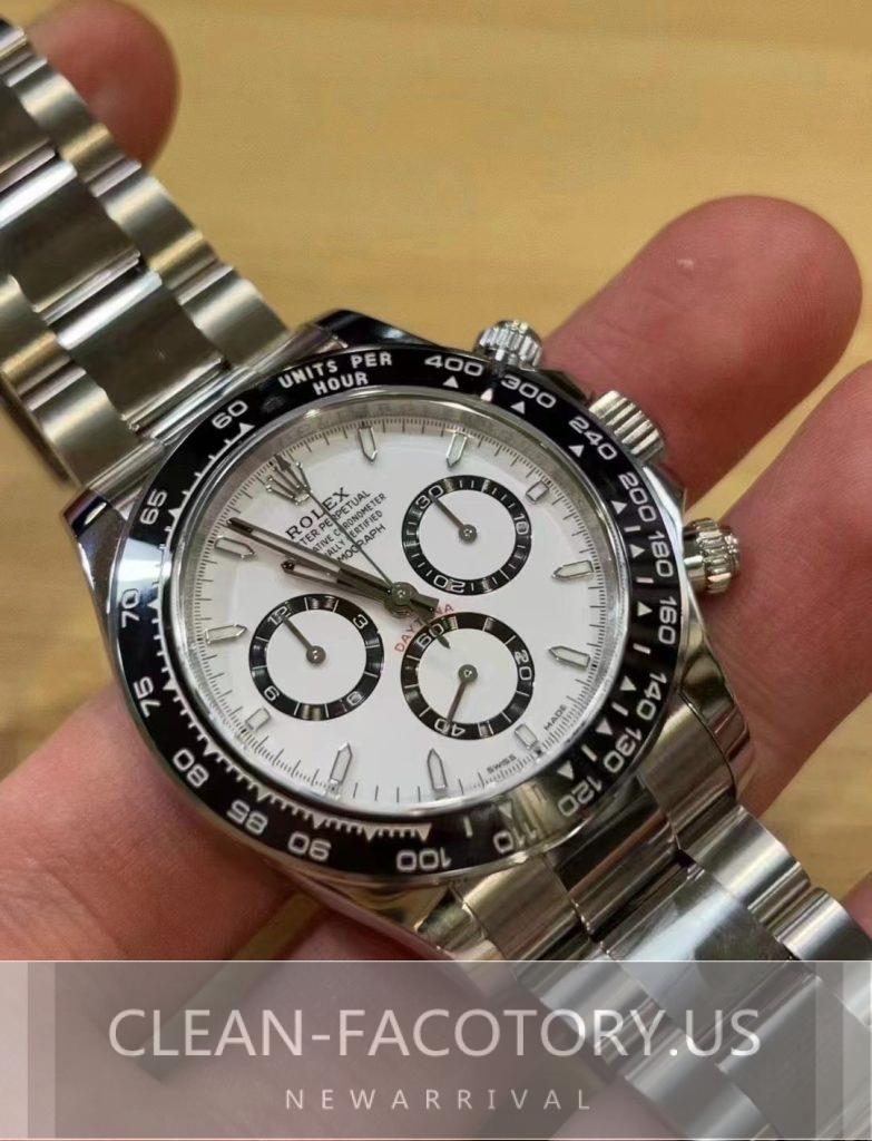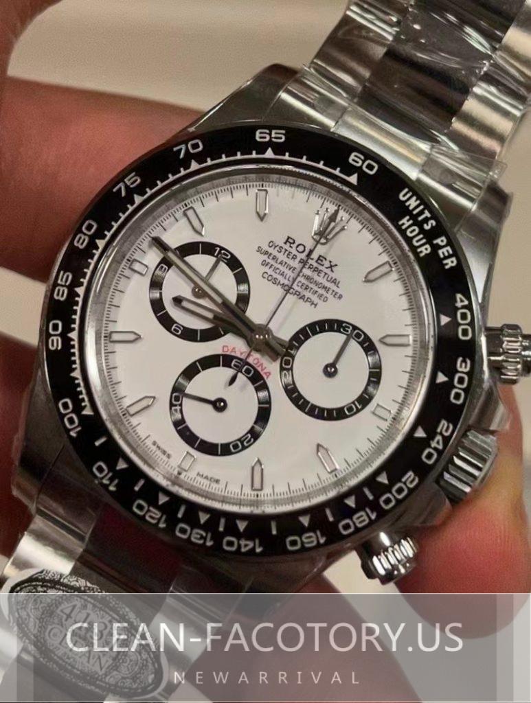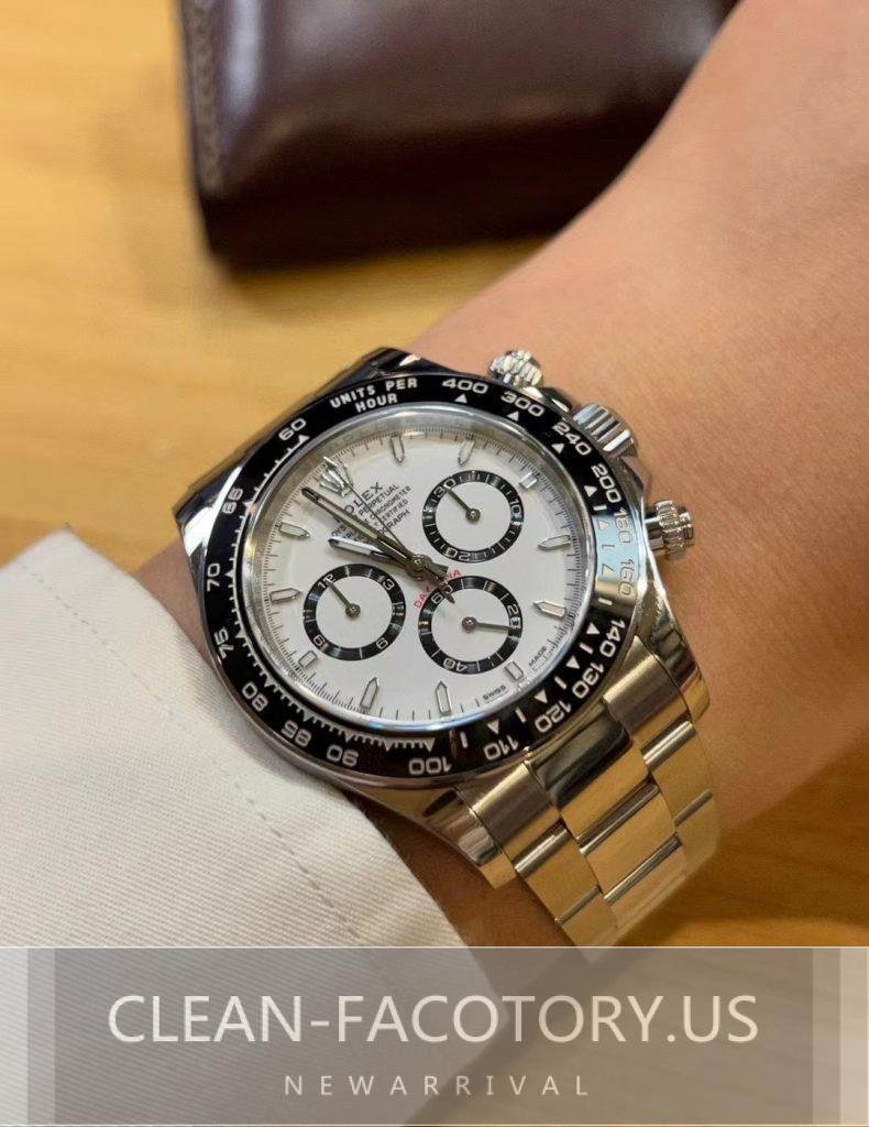 The Clean Factory’s White Panda Daytona 4131 movement represents a fusion of precise craftsmanship and exceptional design. In the latest 126500 white model, Clean Factory has successfully replicated Rolex’s iconic design, while introducing subtle improvements, making this watch not just a replica, but a piece of art. Behind the white dial, the delicately silvered sub-dial edges with added bright rings significantly enhance the overall visual appeal. Clean Factory‘s relentless pursuit of detail ensures that each White Panda Daytona showcases unparalleled quality.