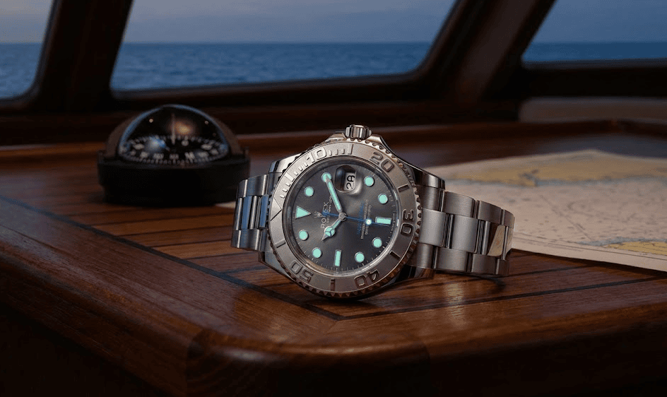 The Yacht-Master, true to its marine heritage, is designed for optimal readability even in dim lighting. The luminescent coating on the hour markers and hands ensures that the watch is readable even in the darkest conditions, whether deep under the sea or during nighttime on the deck.