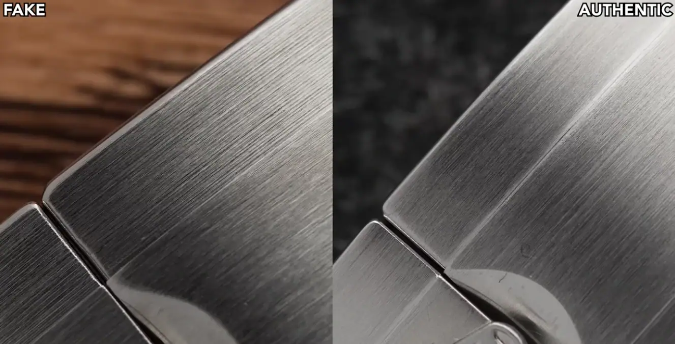 The most critical junction on any Oyster case is where the bracelet meets the watch head—the Solid End Links (SEL). On genuine Submariners, this fitment is so precise that it appears as though the bracelet organically grows out of the case.