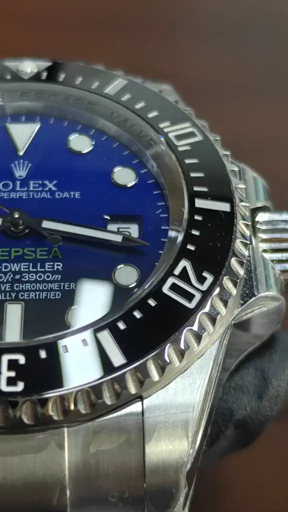 ORIGINAL GAS ESCAPE VALVEandRING LOCK SYSTEMengravings on the Rehaut are executed with sub-micron laser precision, perfectly aligning with the dial markers. - Helium Release Valve (HRV): Integrated at the 9 o’clock position, the HRV is a mechanically functional component, seated flush against the case with zero microscopic gaps.