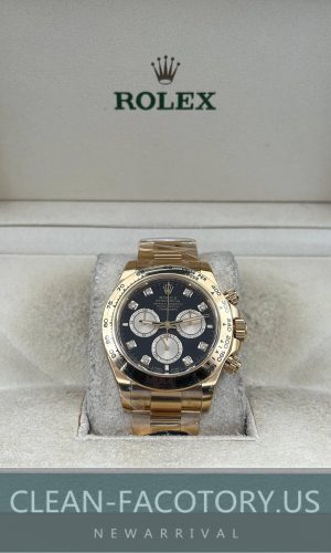 Clean Factory Rolex Daytona 126508 Black Diamond Dial, Gold Bezel, Yellow Gold wrapped 904L Steel, Best Edition 4131 Movement