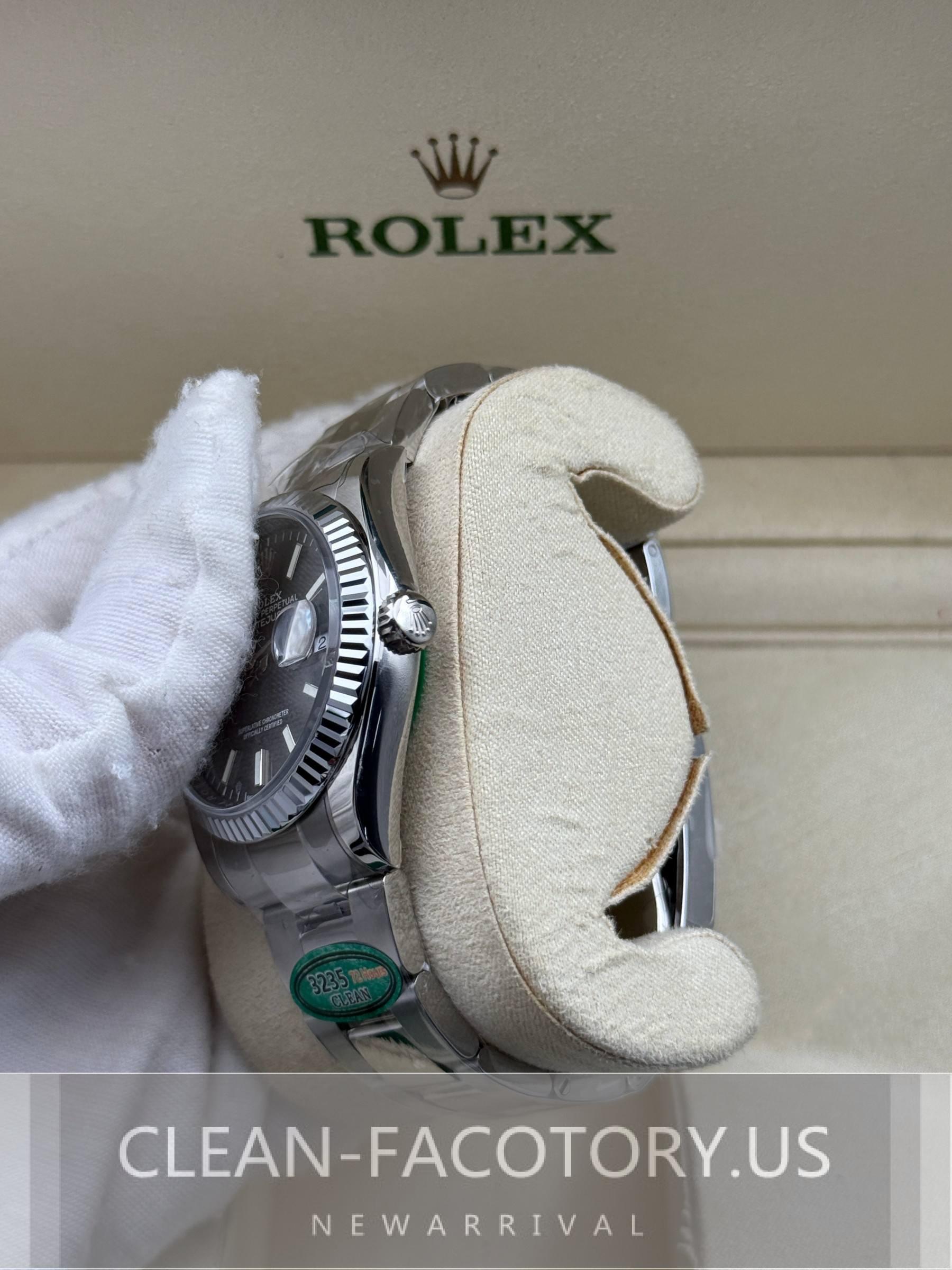 – **CASE**:Our Clean Factory Super Clone watches feature a 36mm solid 904L stainless steel construction, ensuring an exact match to Genuine Rolex 904L steel. It includes a screw-down case-back and a Twinlock double waterproofness system screw-down winding crown for superior water resistance. The ROLEX laser engraving on the Rehaut ring adds authenticity, while a DLC scratch-protection coating ensures durability. Every detail, including dimensions and weight, is faithfully replicated to be 100% identical to genuine Rolex watches, allowing for seamless part interchangeability.
