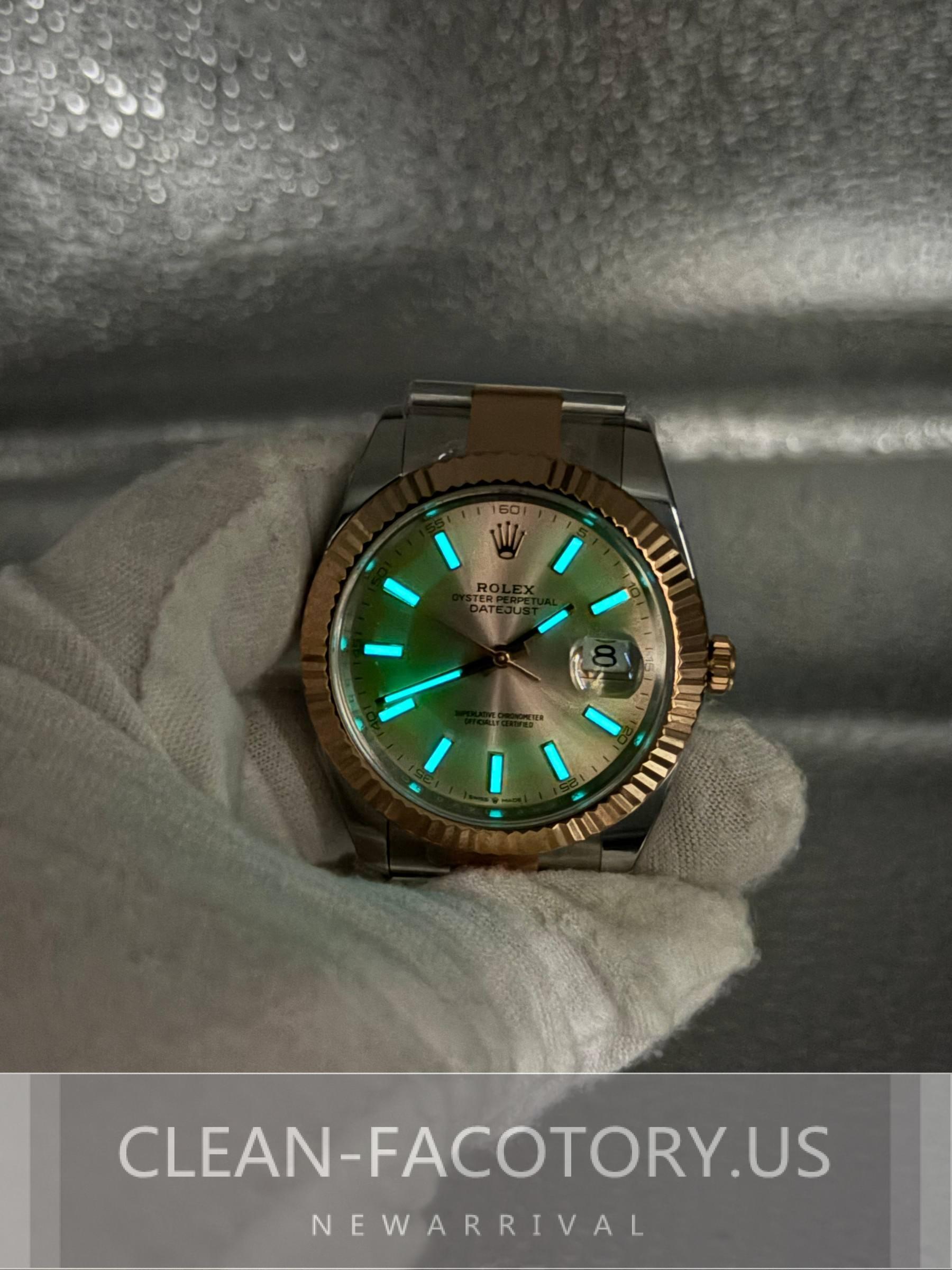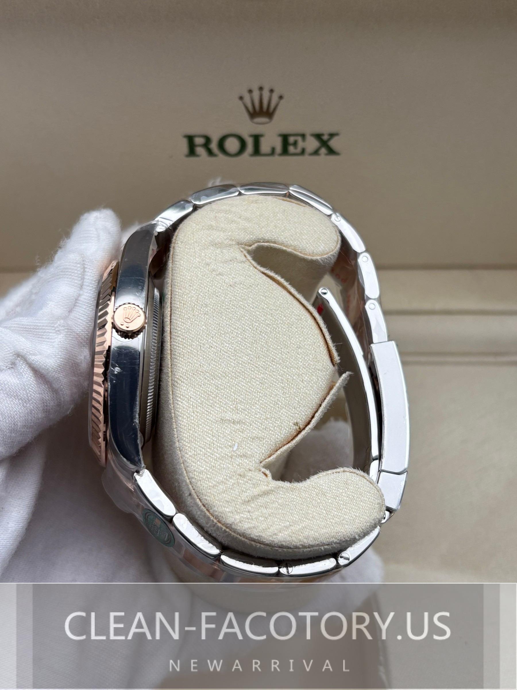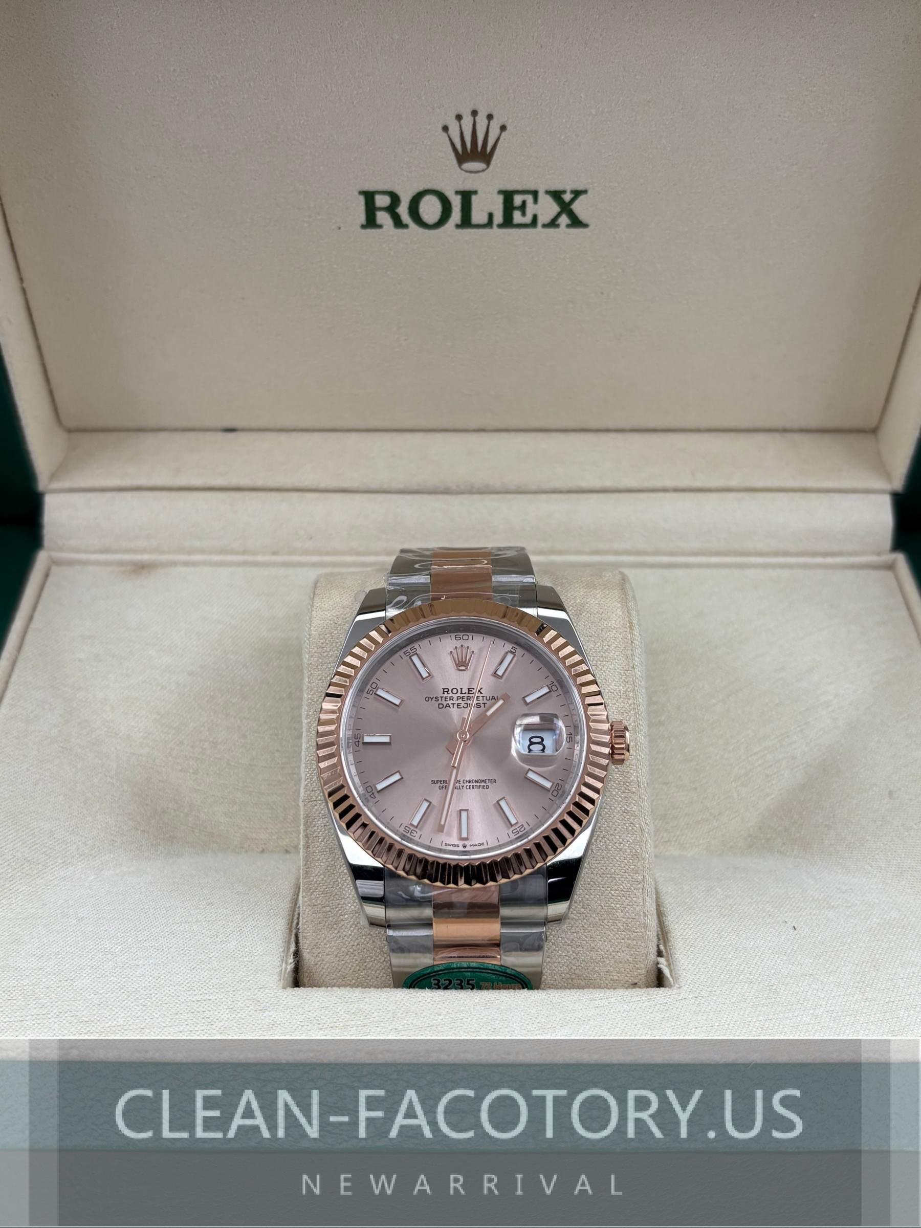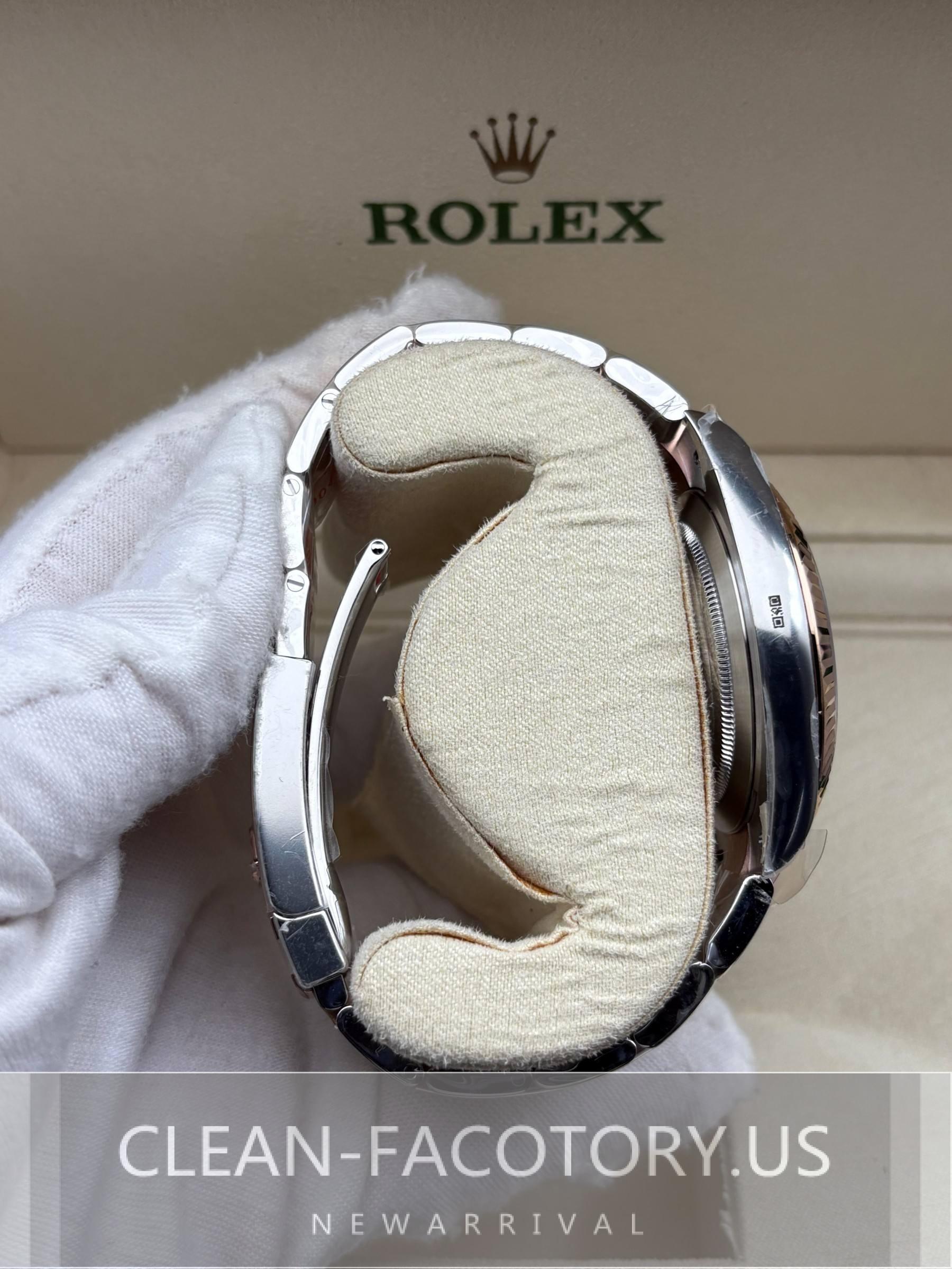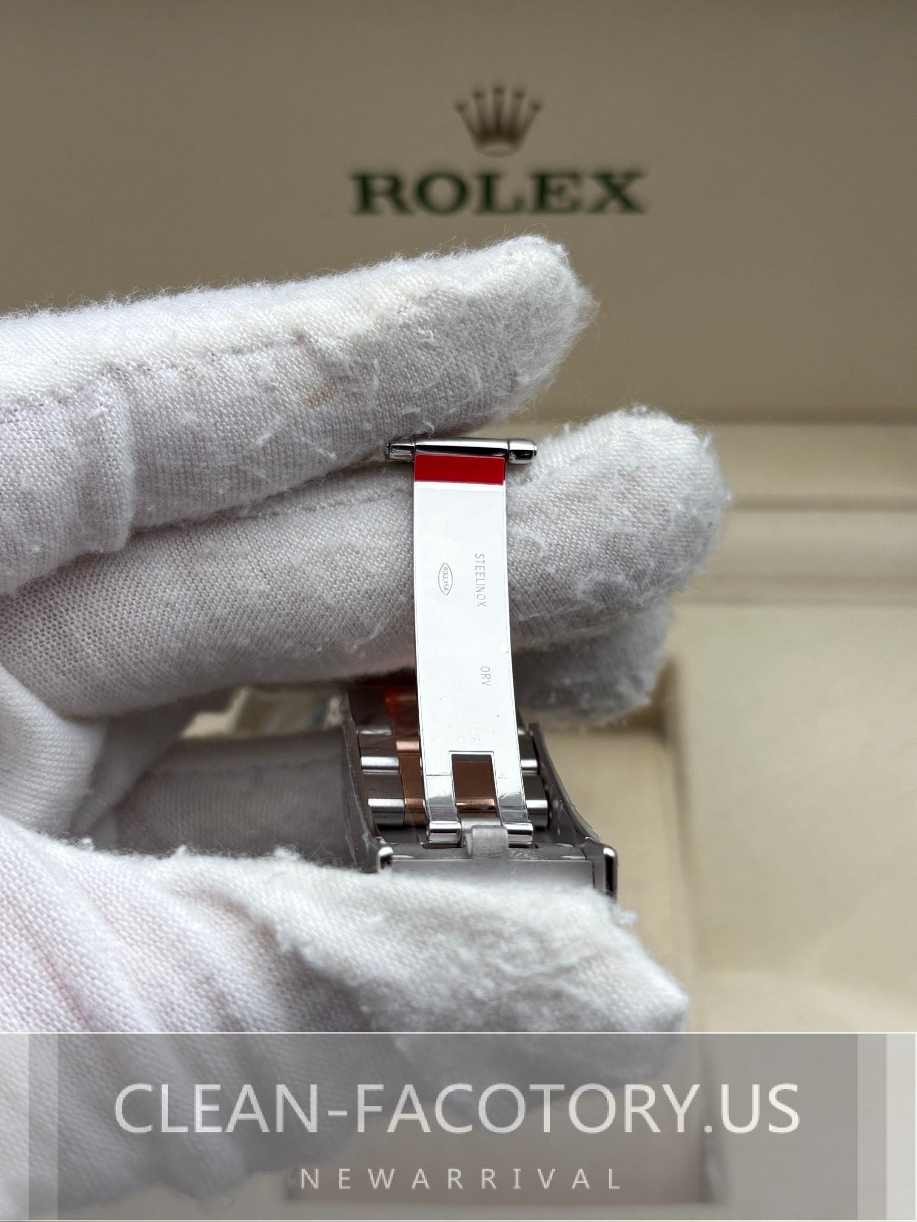 – **CASE**:Clean Factory presents the 41mm 2-tone 18k Rose Gold wrapped Solid 904L Stainless steel case, mirroring the authentic Rolex 904L steel in a monobloc construction. The screw-down case-back and Twinlock double waterproofness system with a screw-down winding crown are testaments to our dedication to durability and quality. The case features the iconic ROLEXROLEX laser engraving on the Rehaut ring and is protected by a DLC scratch-protection coating. The dimensions are meticulously matched to the genuine model, ensuring a perfect replica. All parts are interchangeable with the original Rolex, showcasing Clean Factory’s commitment to compatibility and precision.