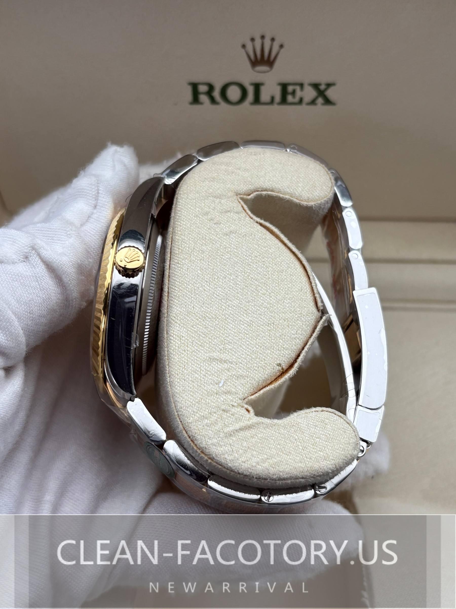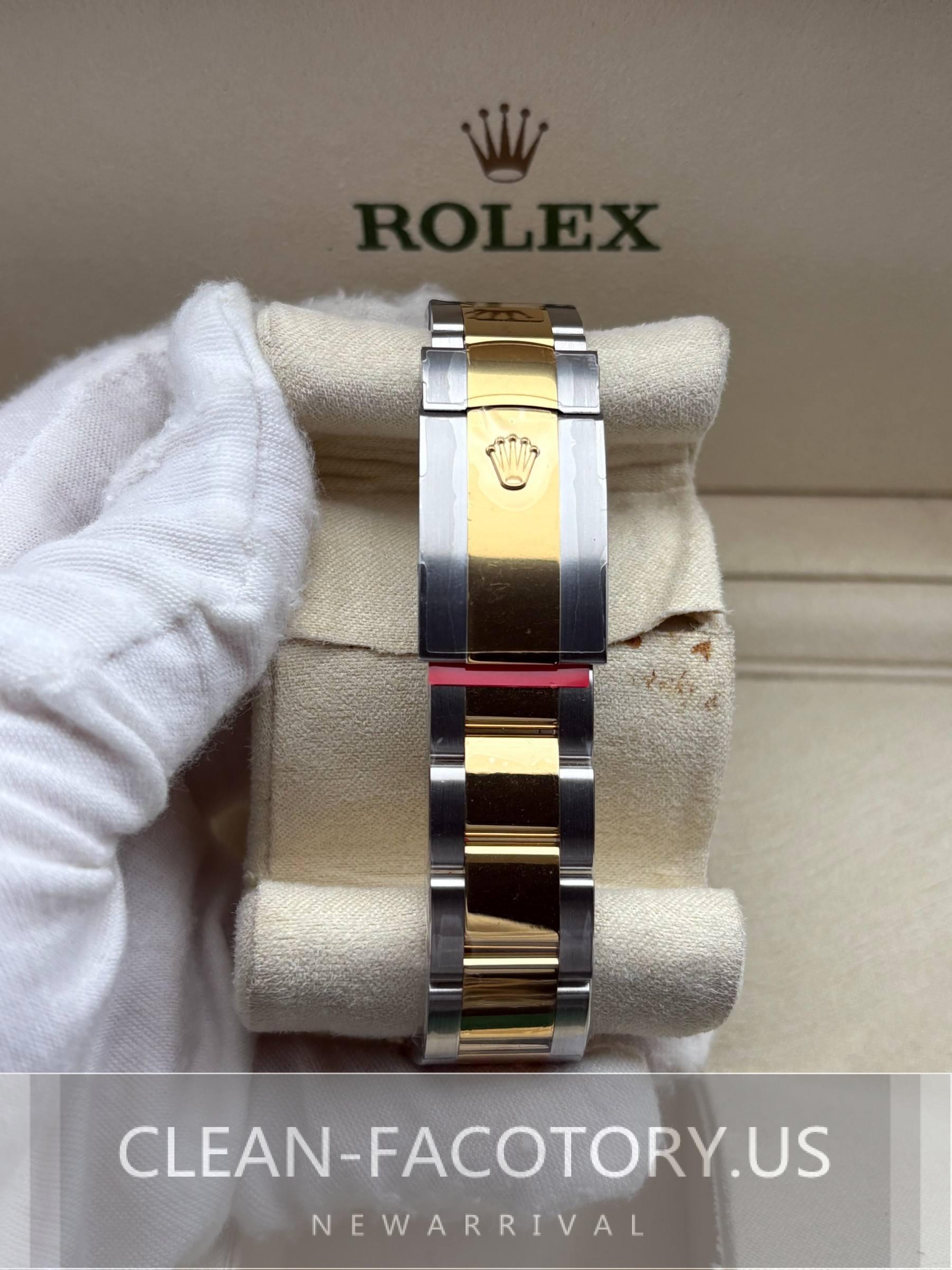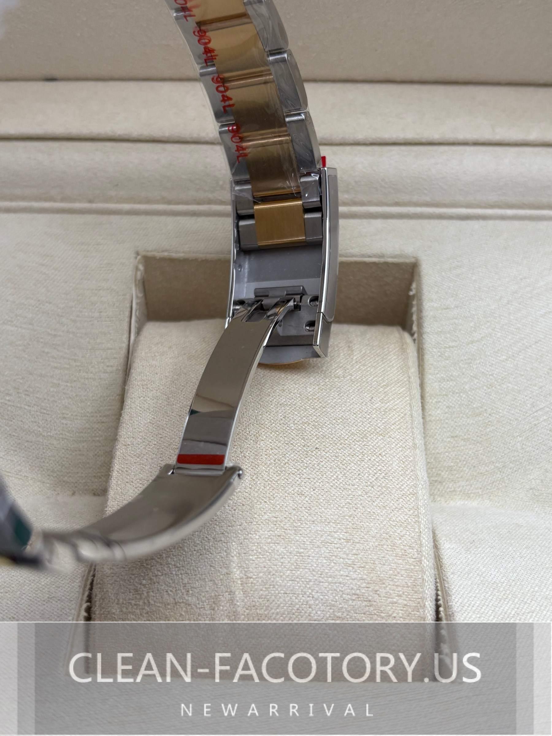– **CASE**:Clean Factory presents the 41mm 2-tone 18k Yellow Gold wrapped Solid 904L Stainless steel case, mirroring the authentic Rolex 904L steel in a monobloc construction. The screw-down case-back and Twinlock double waterproofness system with a screw-down winding crown are testaments to our dedication to durability and quality. The case features the iconic ROLEXROLEX laser engraving on the Rehaut ring and is protected by a DLC scratch-protection coating. The dimensions are meticulously matched to the genuine model, ensuring a perfect replica. All parts are interchangeable with the original Rolex, showcasing Clean Factory’s commitment to compatibility and precision.