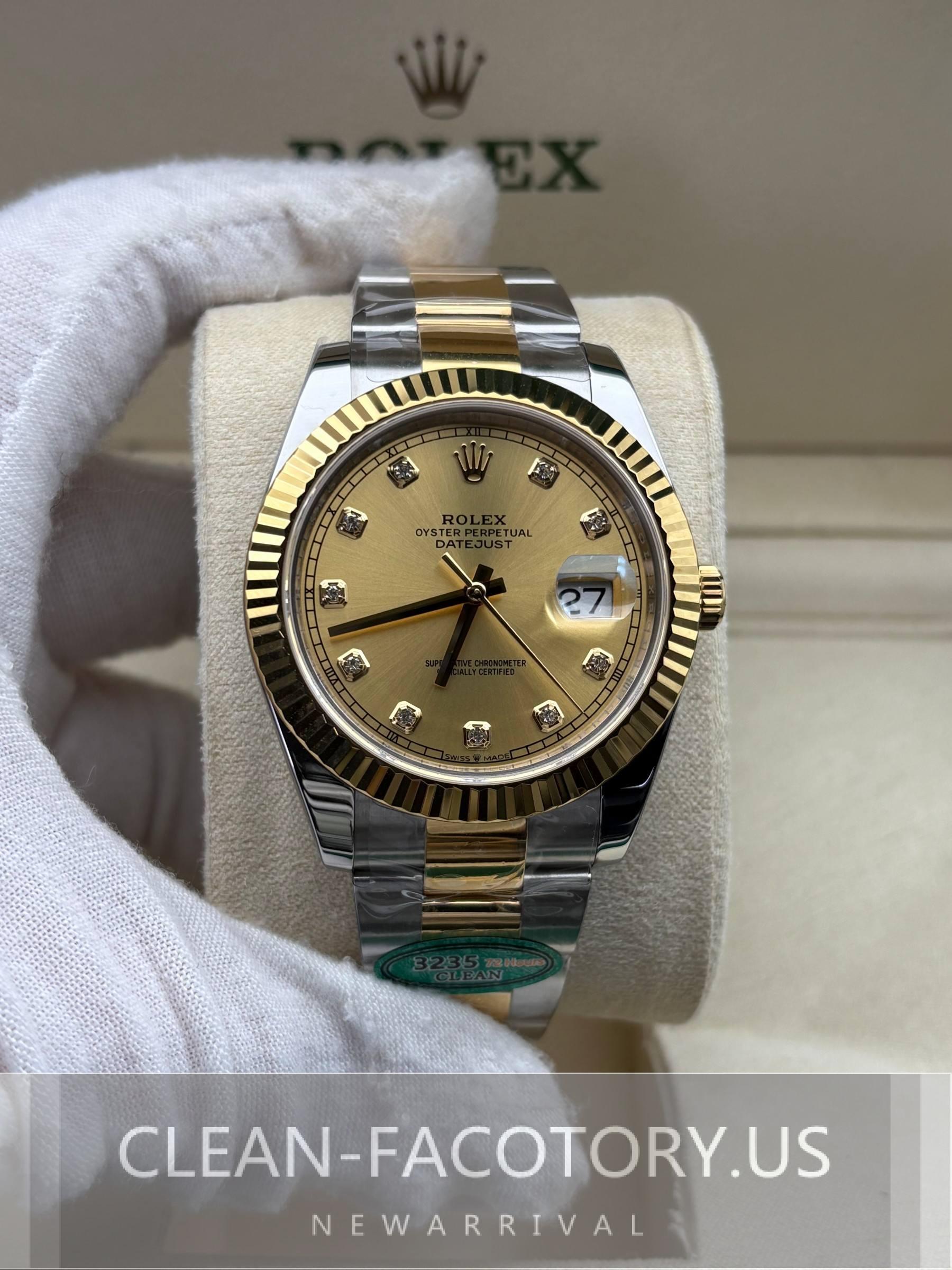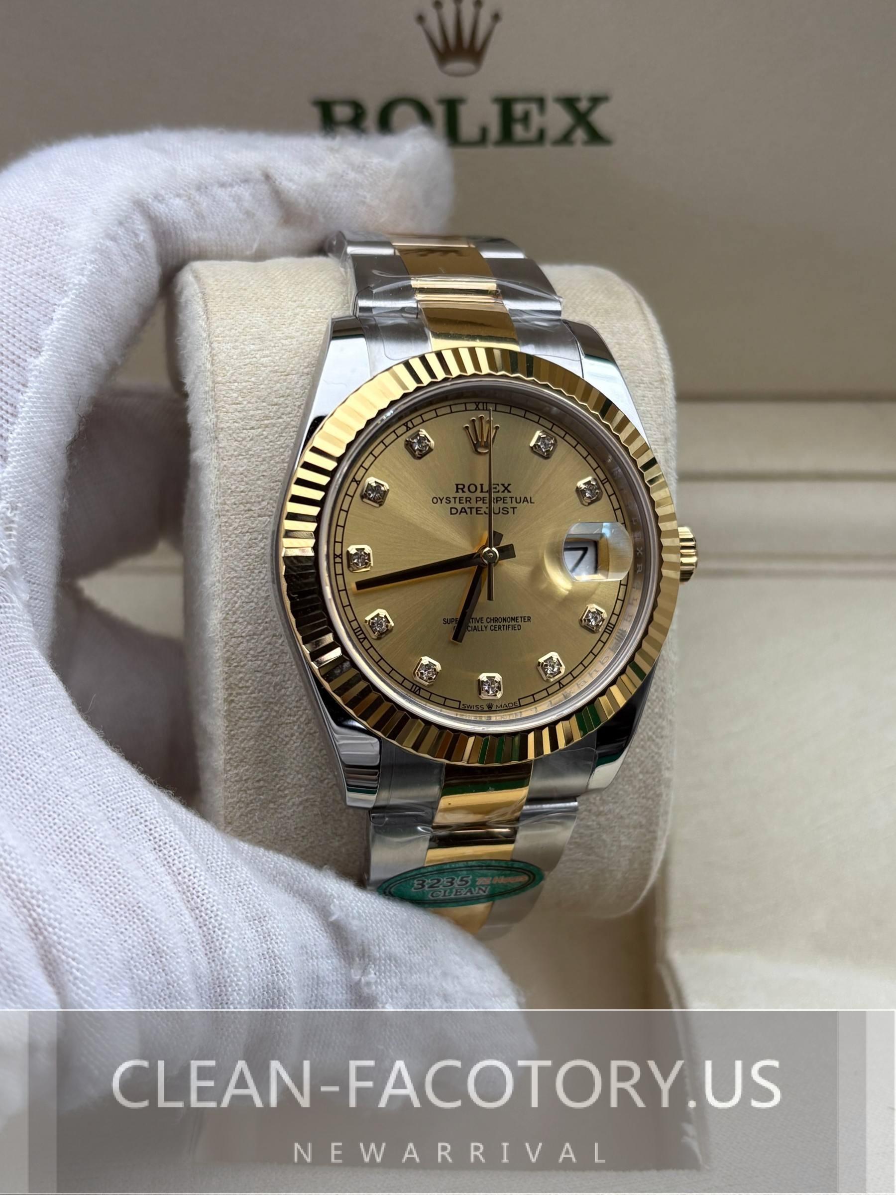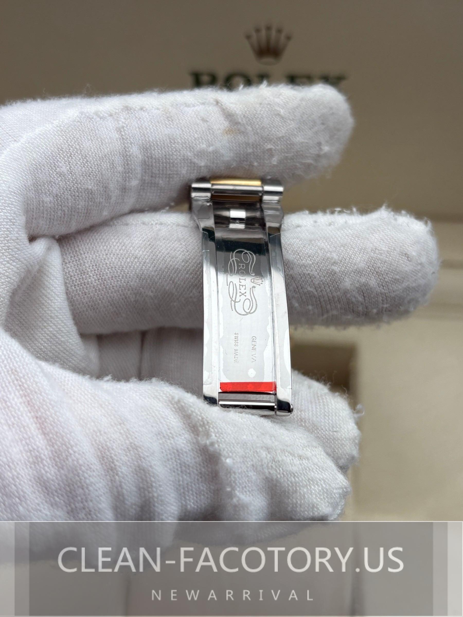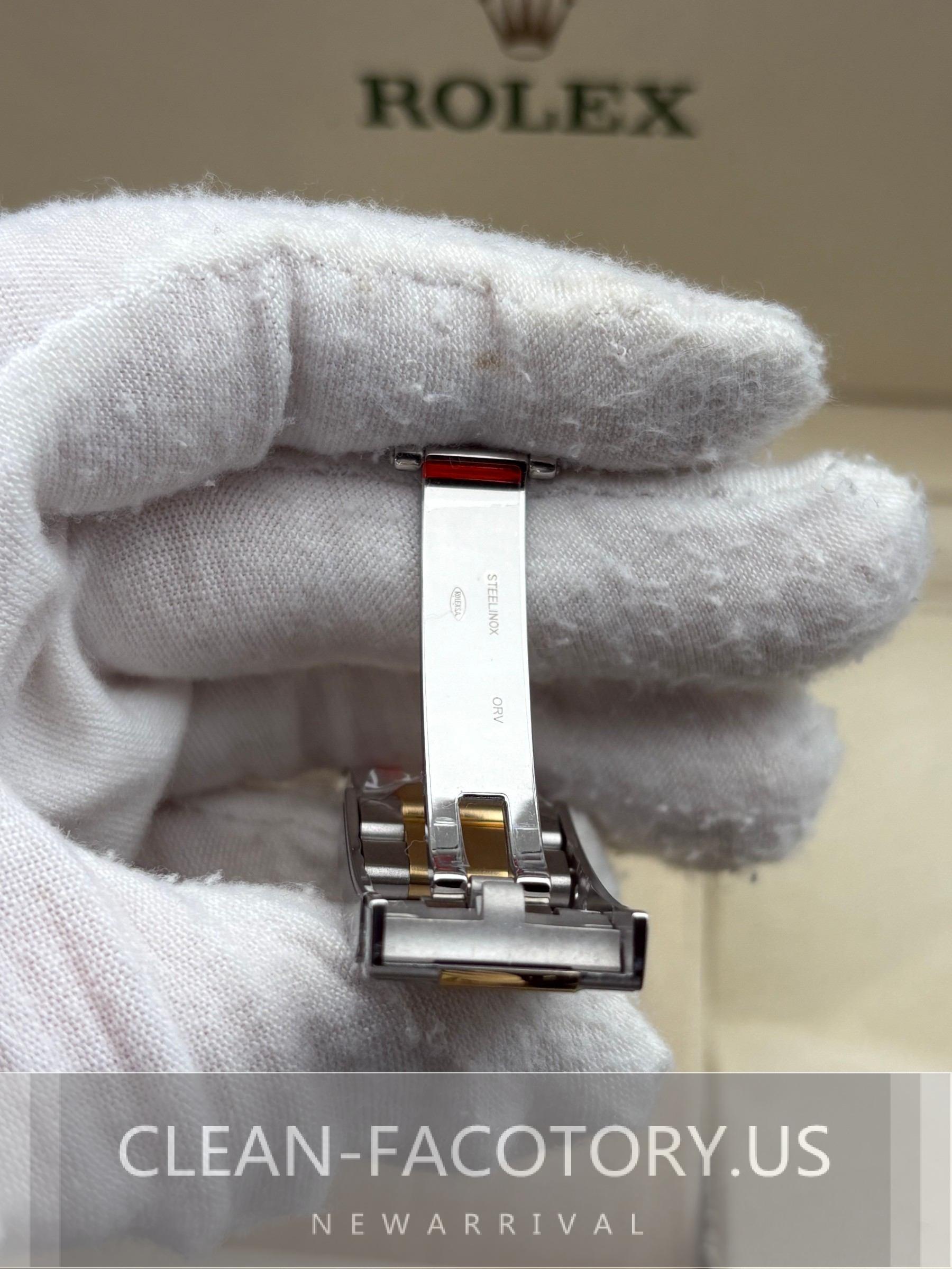 – **CASE**:Clean Factory presents the 41mm 2-tone 18k Yellow Gold wrapped Solid 904L Stainless steel case, mirroring the authentic Rolex 904L steel in a monobloc construction. The screw-down case-back and Twinlock double waterproofness system with a screw-down winding crown are testaments to our dedication to durability and quality. The case features the iconic ROLEXROLEX laser engraving on the Rehaut ring and is protected by a DLC scratch-protection coating. The dimensions are meticulously matched to the genuine model, ensuring a perfect replica. All parts are interchangeable with the original Rolex, showcasing Clean Factory’s commitment to compatibility and precision.