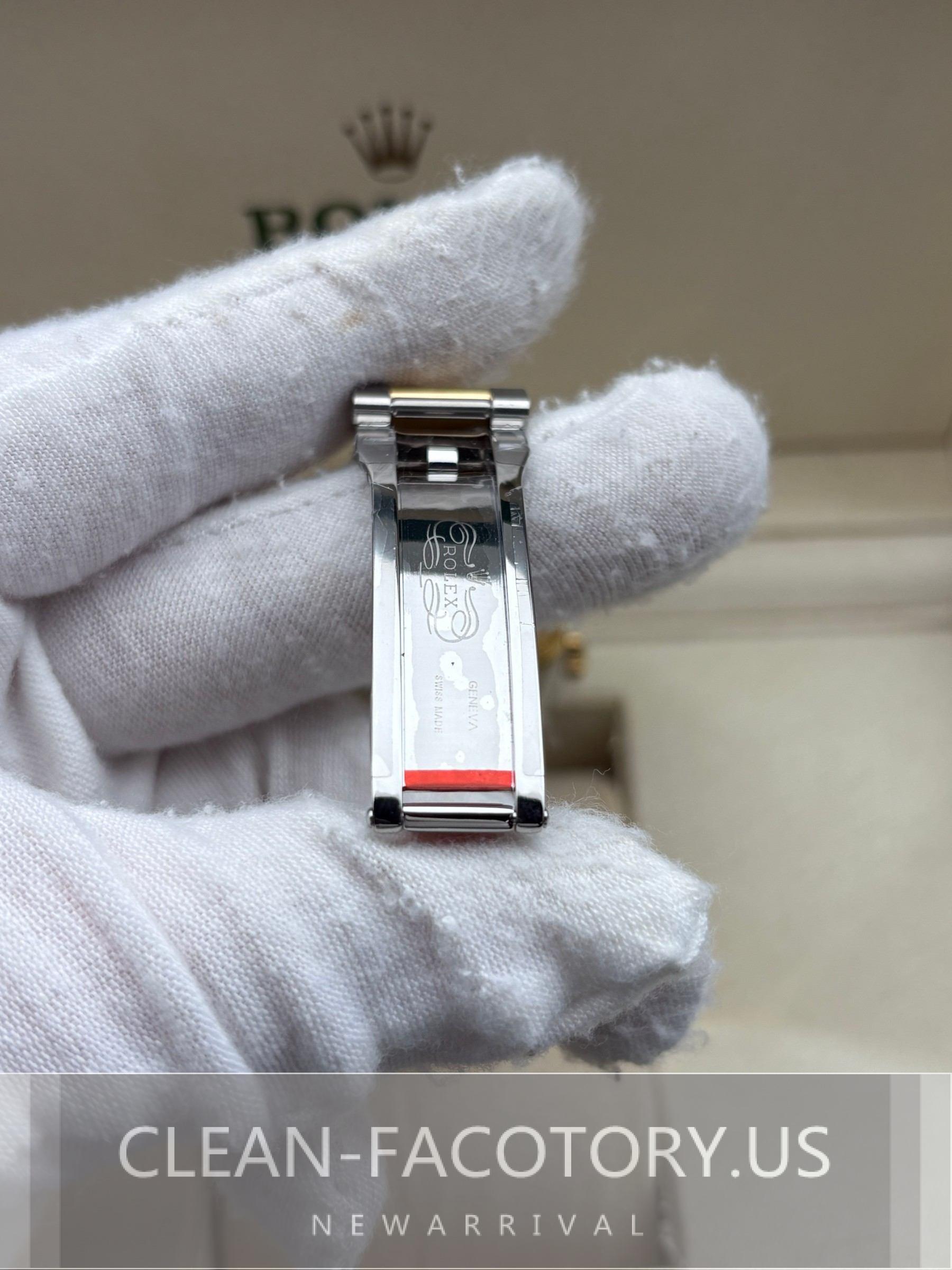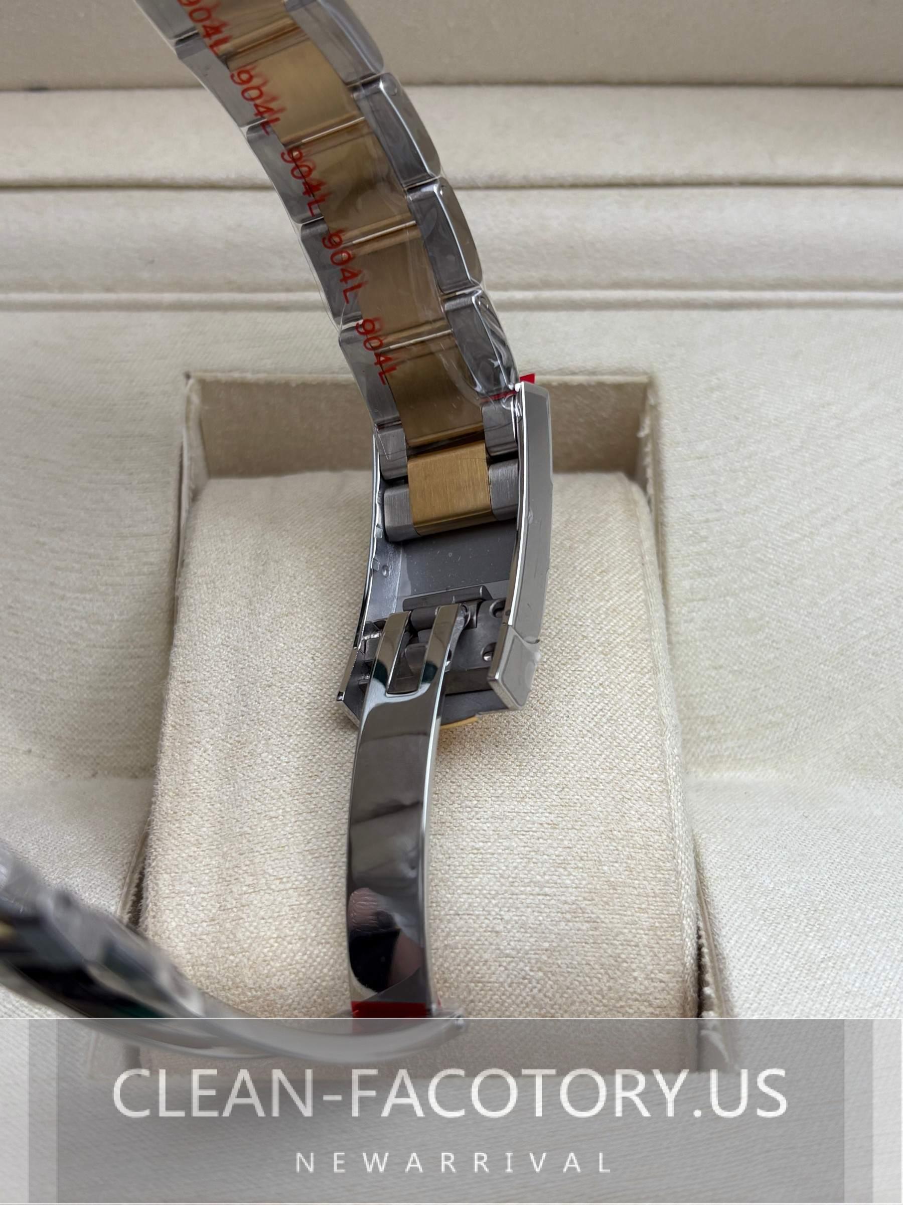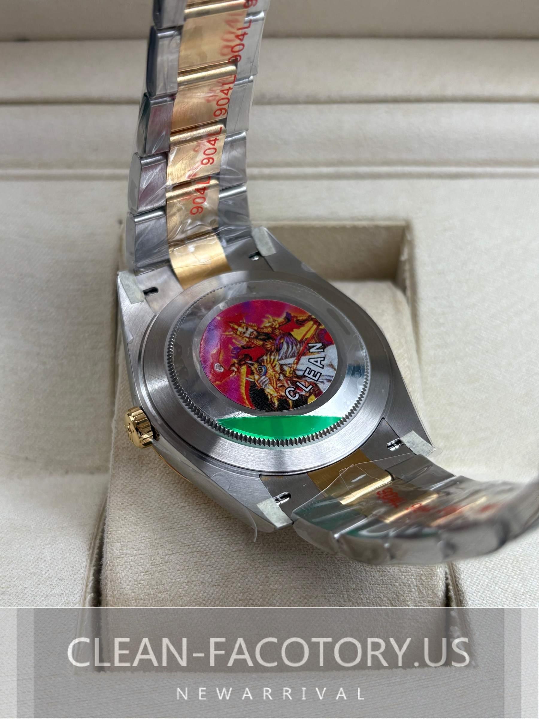 – **CASE**:Clean Factory presents the 41mm 2-tone 18k Yellow Gold wrapped Solid 904L Stainless steel case, mirroring the authentic Rolex 904L steel in a monobloc construction. The screw-down case-back and Twinlock double waterproofness system with a screw-down winding crown are testaments to our dedication to durability and quality. The case features the iconic ROLEXROLEX laser engraving on the Rehaut ring and is protected by a DLC scratch-protection coating. The dimensions are meticulously matched to the genuine model, ensuring a perfect replica. All parts are interchangeable with the original Rolex, showcasing Clean Factory’s commitment to compatibility and precision.