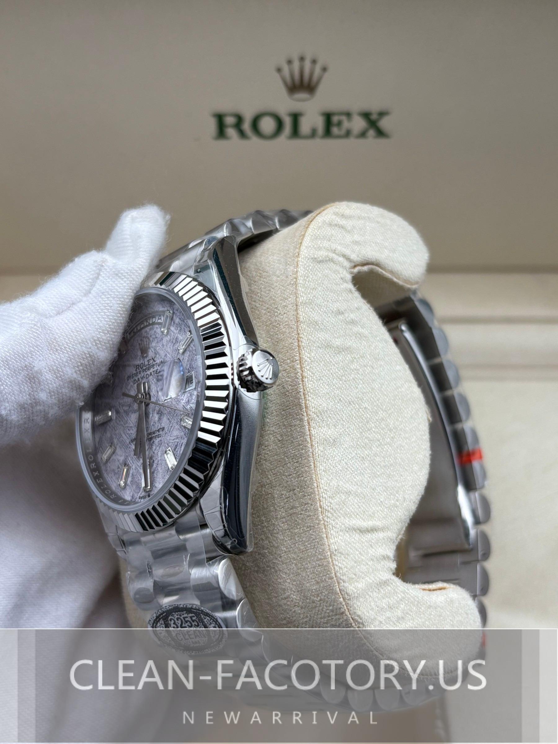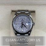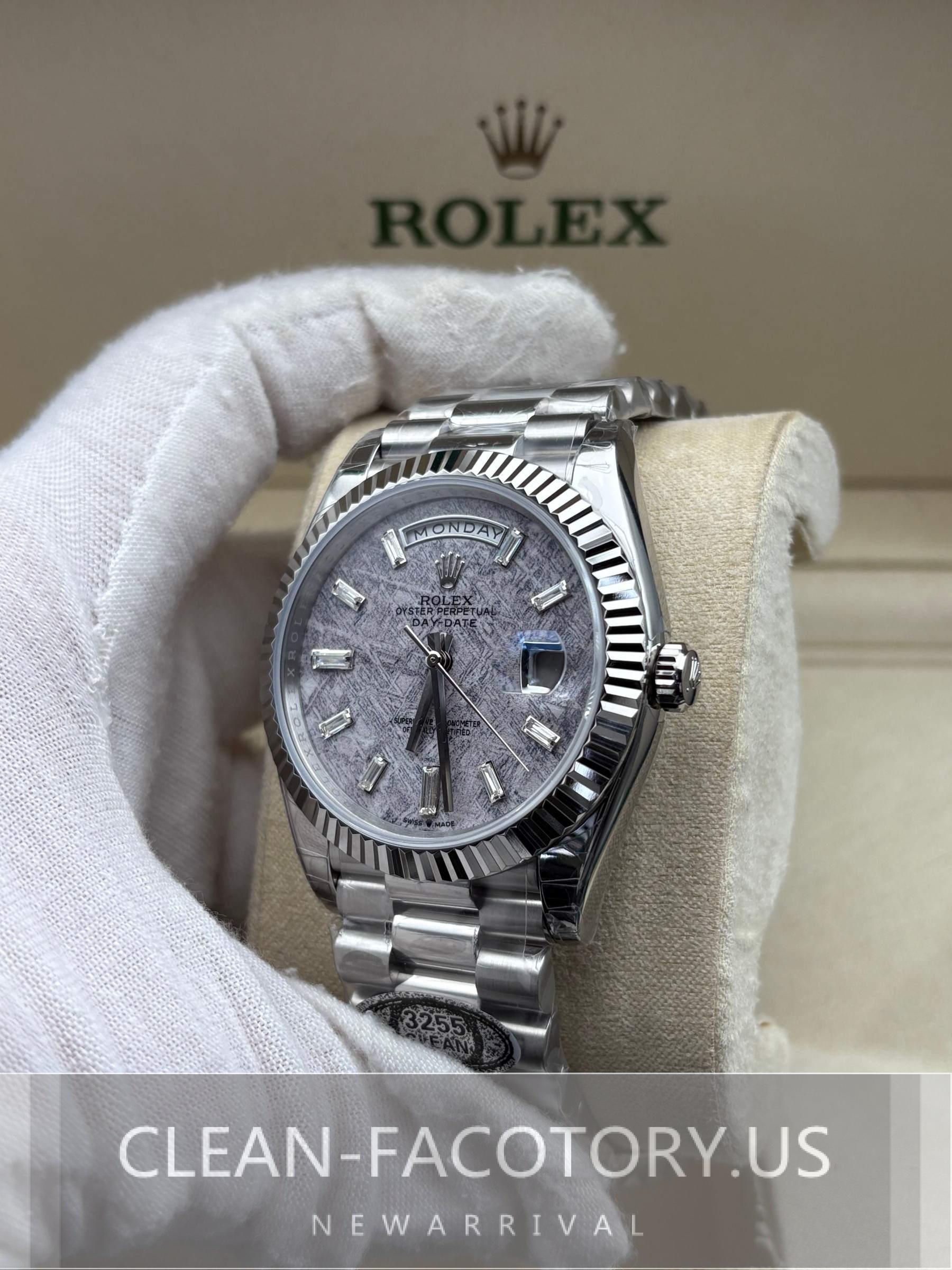 – **Dial**:The dial features a natural meteorite texture with crisp Widmanstätten patterns rendered in a silvery tone that closely mirrors authentic Rolex meteorite finishing. Each streak and crystalline line is individually etched, giving a layered metallic depth rather than flat printing, while the baguette-style hour markers are sharply faceted for clear light reflection. Combined with precise text alignment and clean lacquer sealing, the dial presents a realistic dimensional effect and an appearance highly aligned with the original Day-Date design.