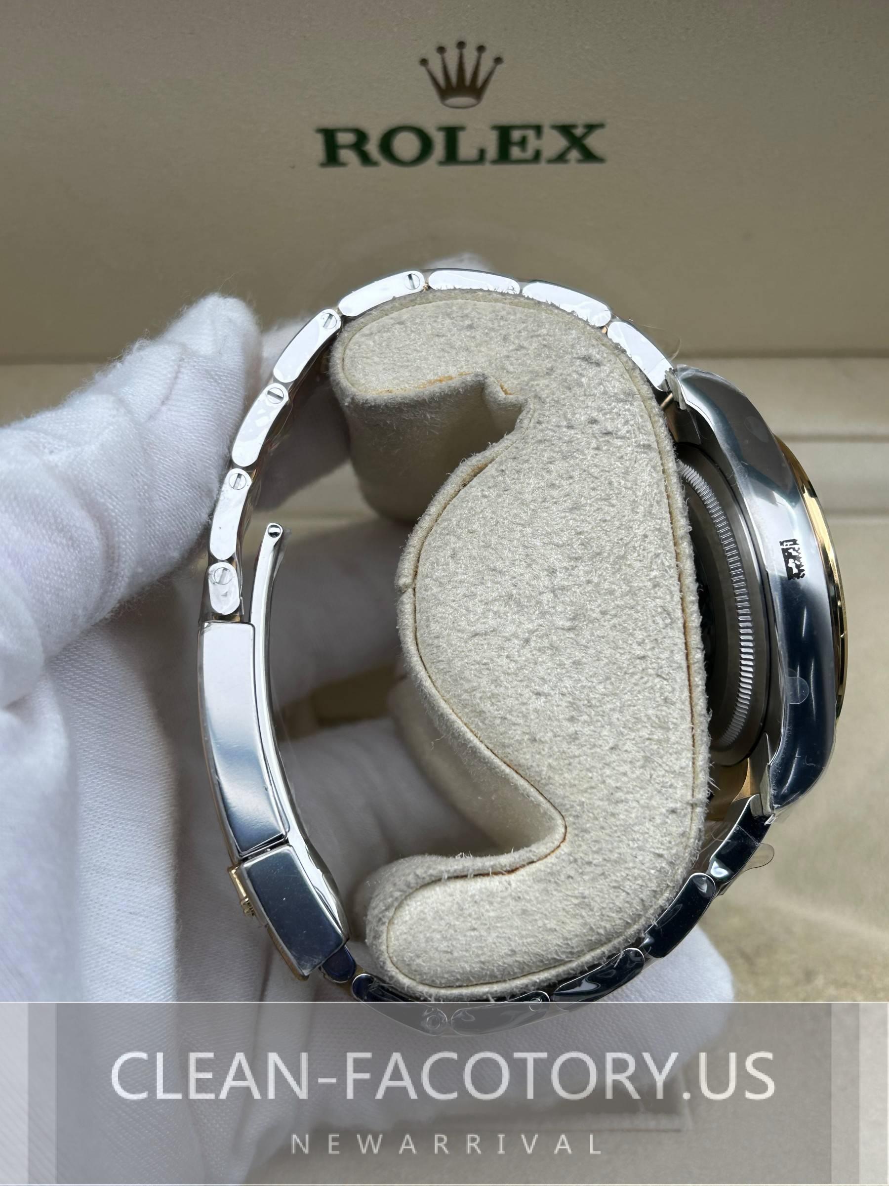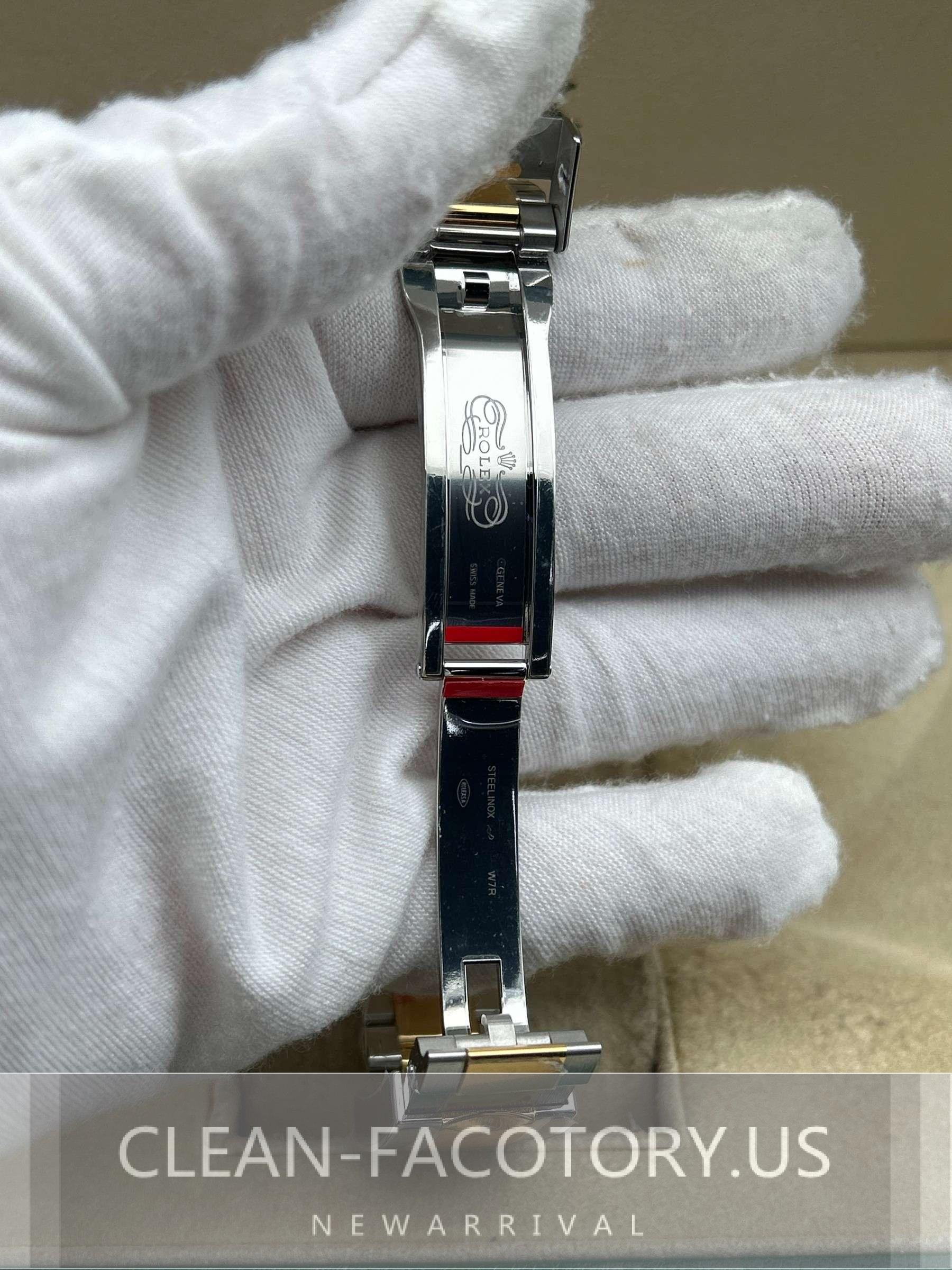 – **CASE**: Clean Factory replica features a 40mm case that combines 18k yellow gold wrapped over solid 904L stainless steel, resembling the monobloc construction of genuine Rolex steel. The screw-down case-back, push-buttons, and winding crown are sealed with synthetic rubber, enhancing water resistance. The watch boasts a ‘ROLEXROLEX’ laser engraving on the Rehaut ring and is protected by a DLC scratch-protection coating. Every dimension is identical to the genuine Rolex, ensuring all parts can be interchanged with the original.
