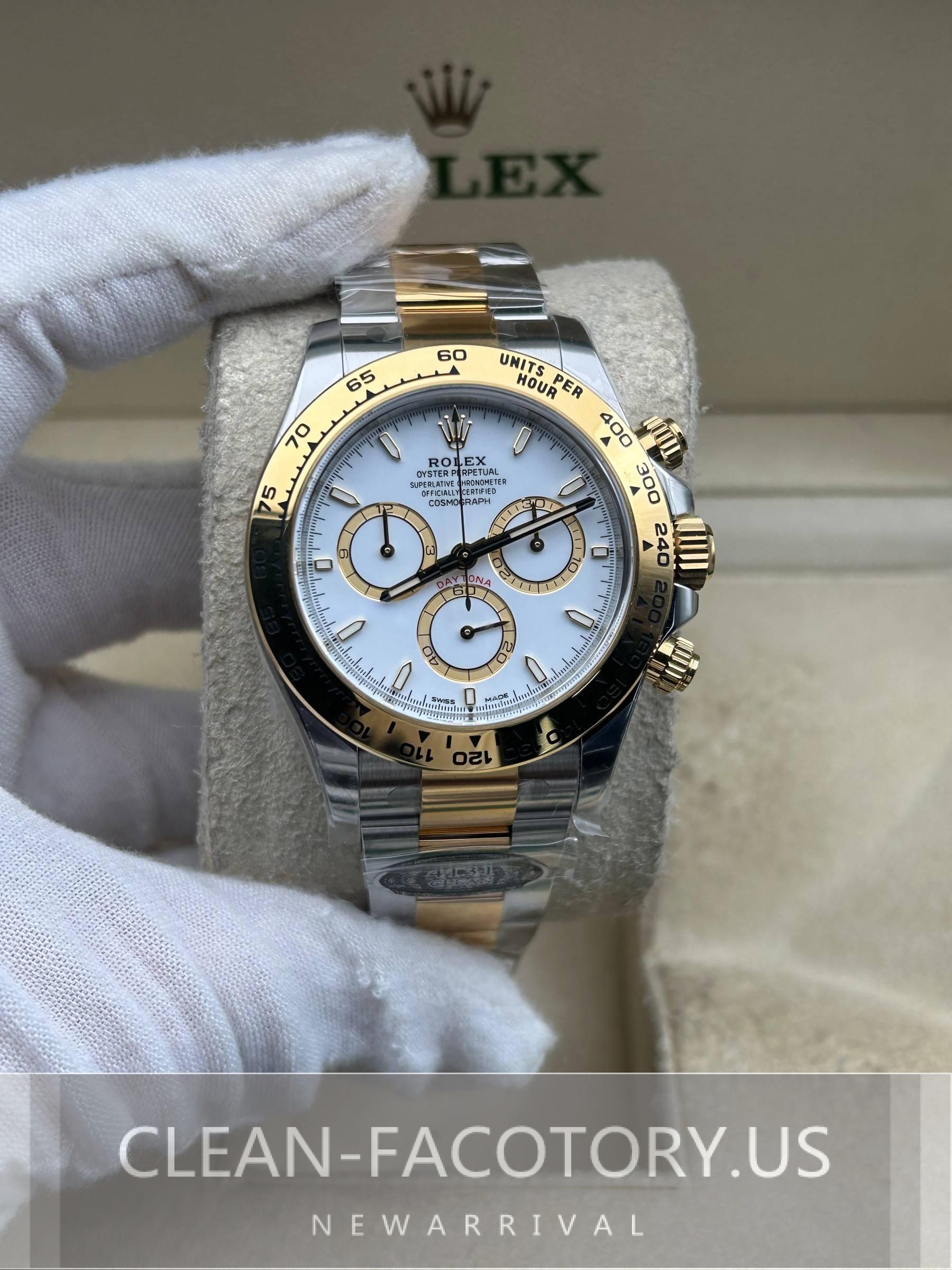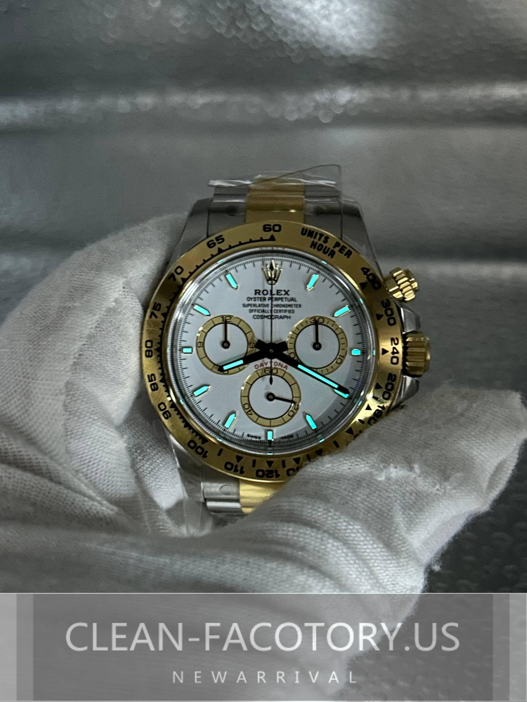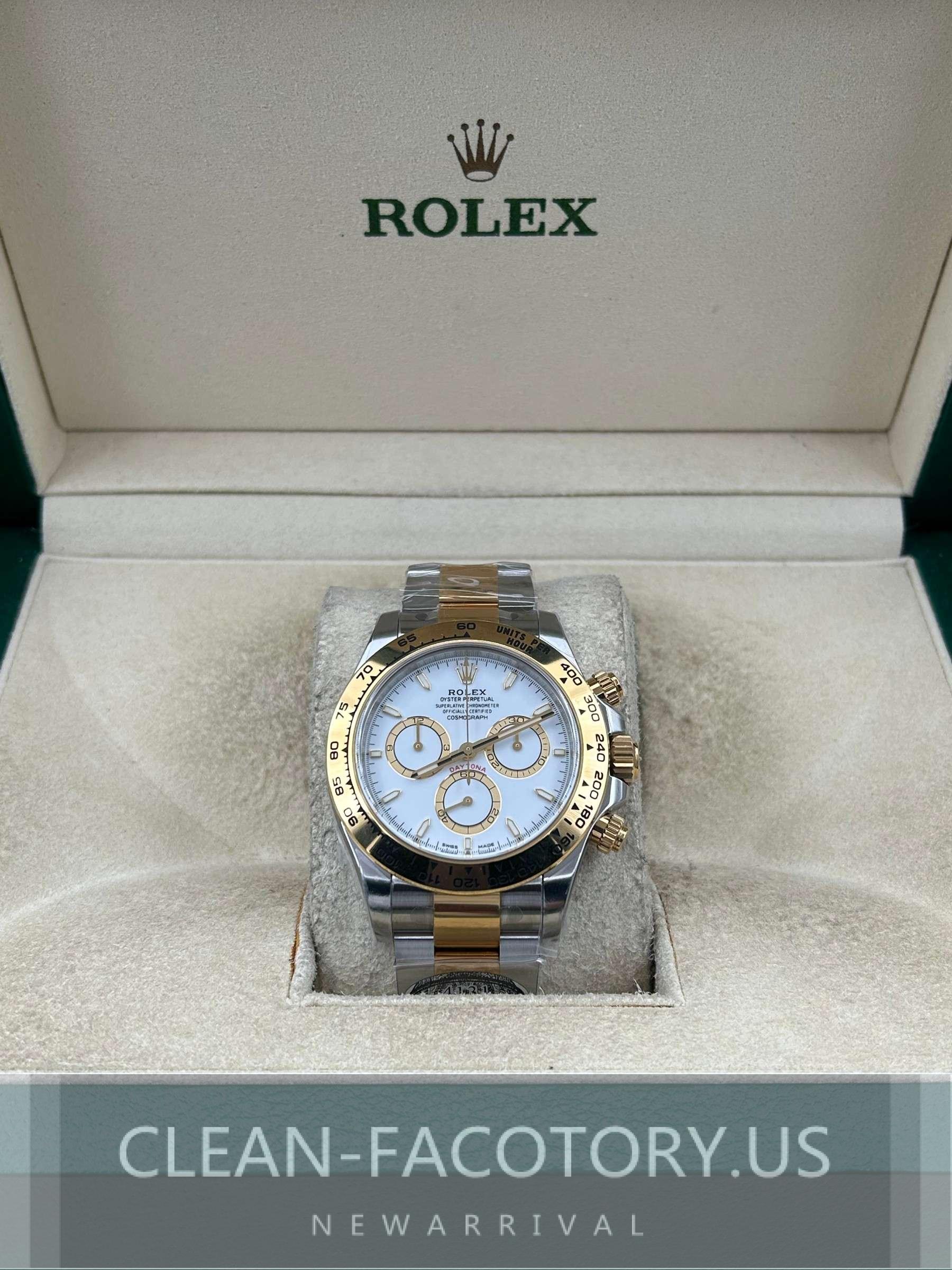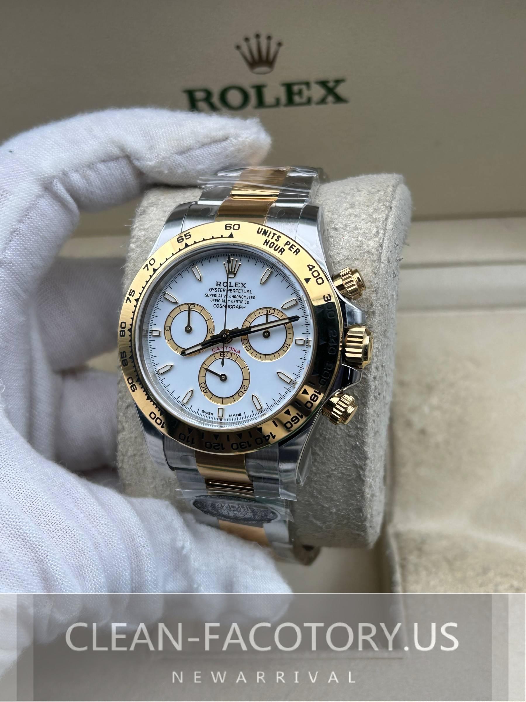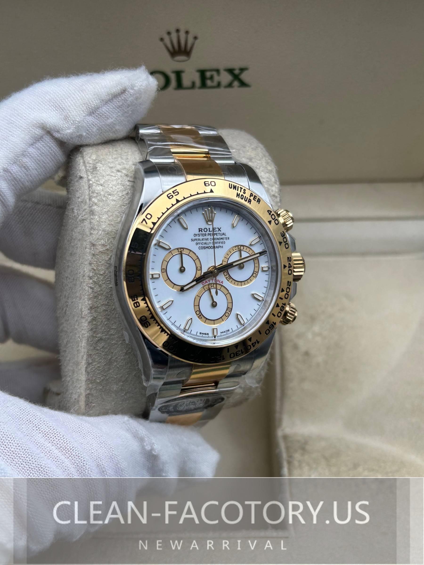 **Clean Factory proudly presents the Rolex Cosmograph Daytona126503 2tone 18k Gold white Replica Watch, a symbol of luxury and precision engineering. This timepiece is expertly crafted to match the original Rolex Cosmograph Daytona in every aspect, from design to functionality.