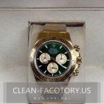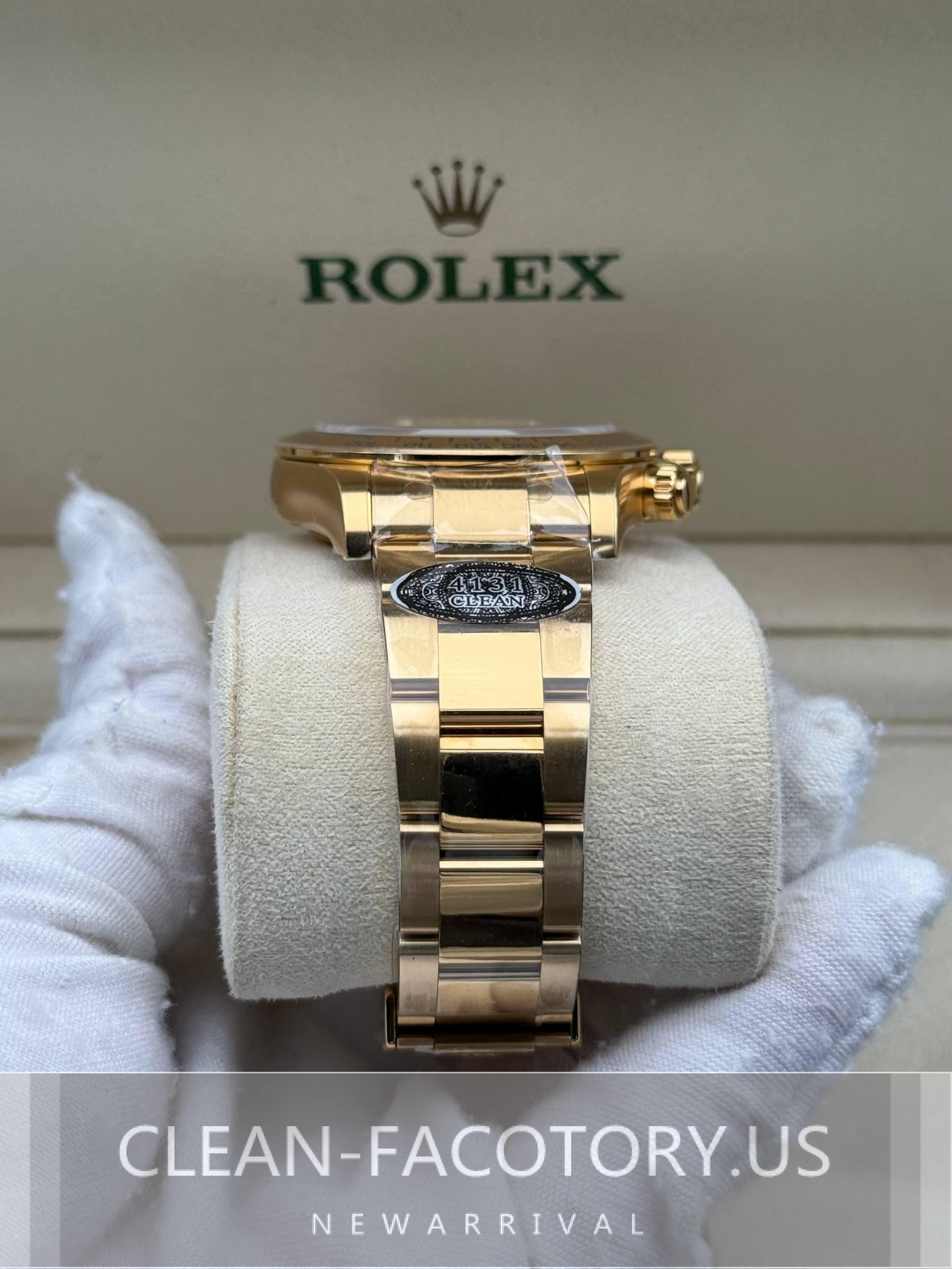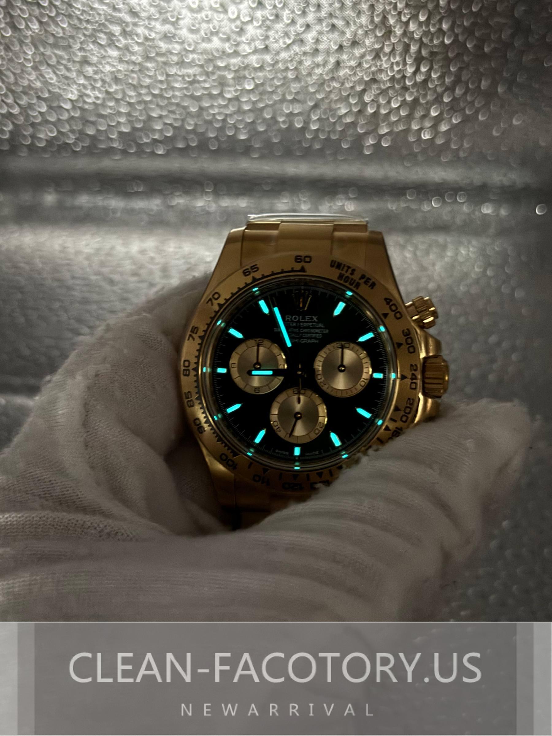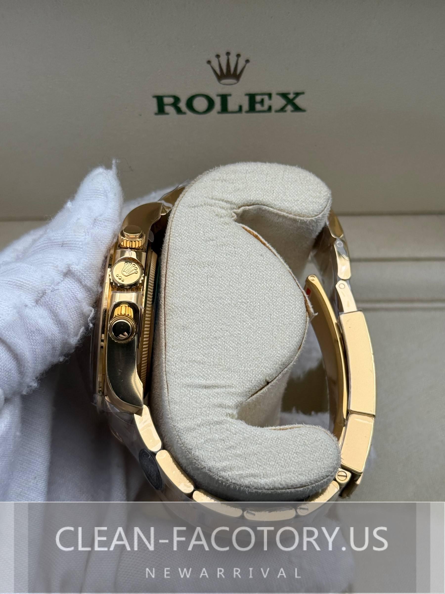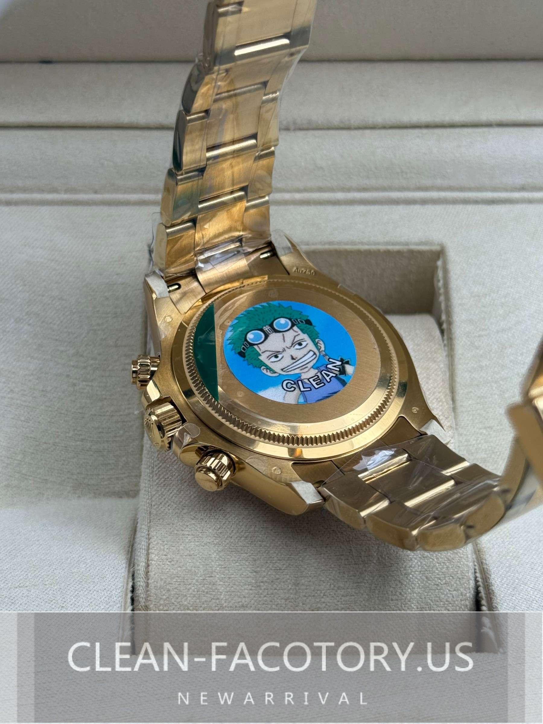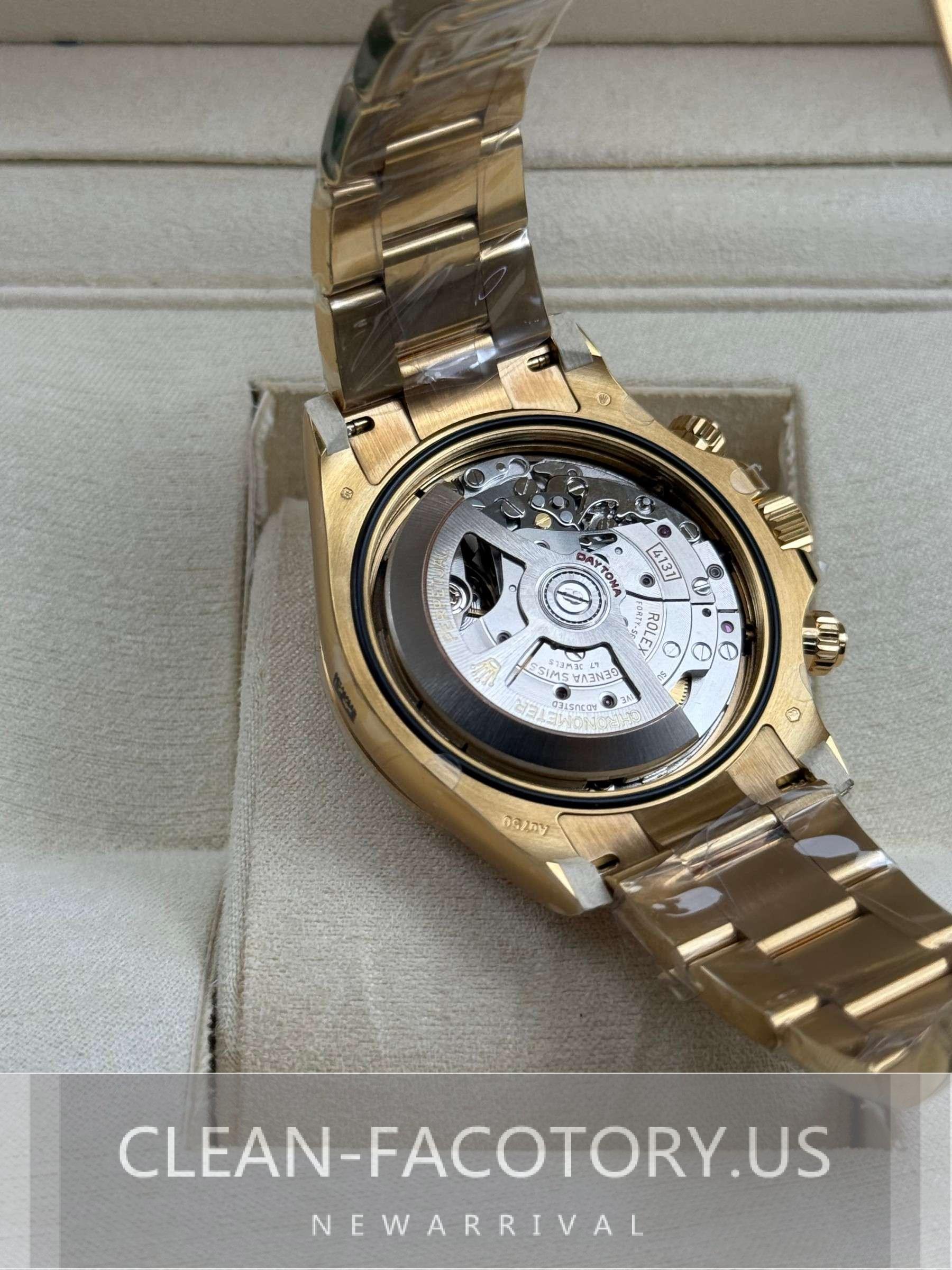 – **CASE**: The daytona watch made in Clean FACTORY is constructed from robust 904L stainless steel with a genuine 18k yellow gold PVD coating. The 40mm case size precisely matches the original. The case is crafted with a one-piece forged process, featuring smooth, refined edges. The solid, screw-down crown is integrated seamlessly with a Swiss rubber seal. The Rehaut is engraved with ‘ROLEXROLEX’, mirroring the authentic design in every aspect.
