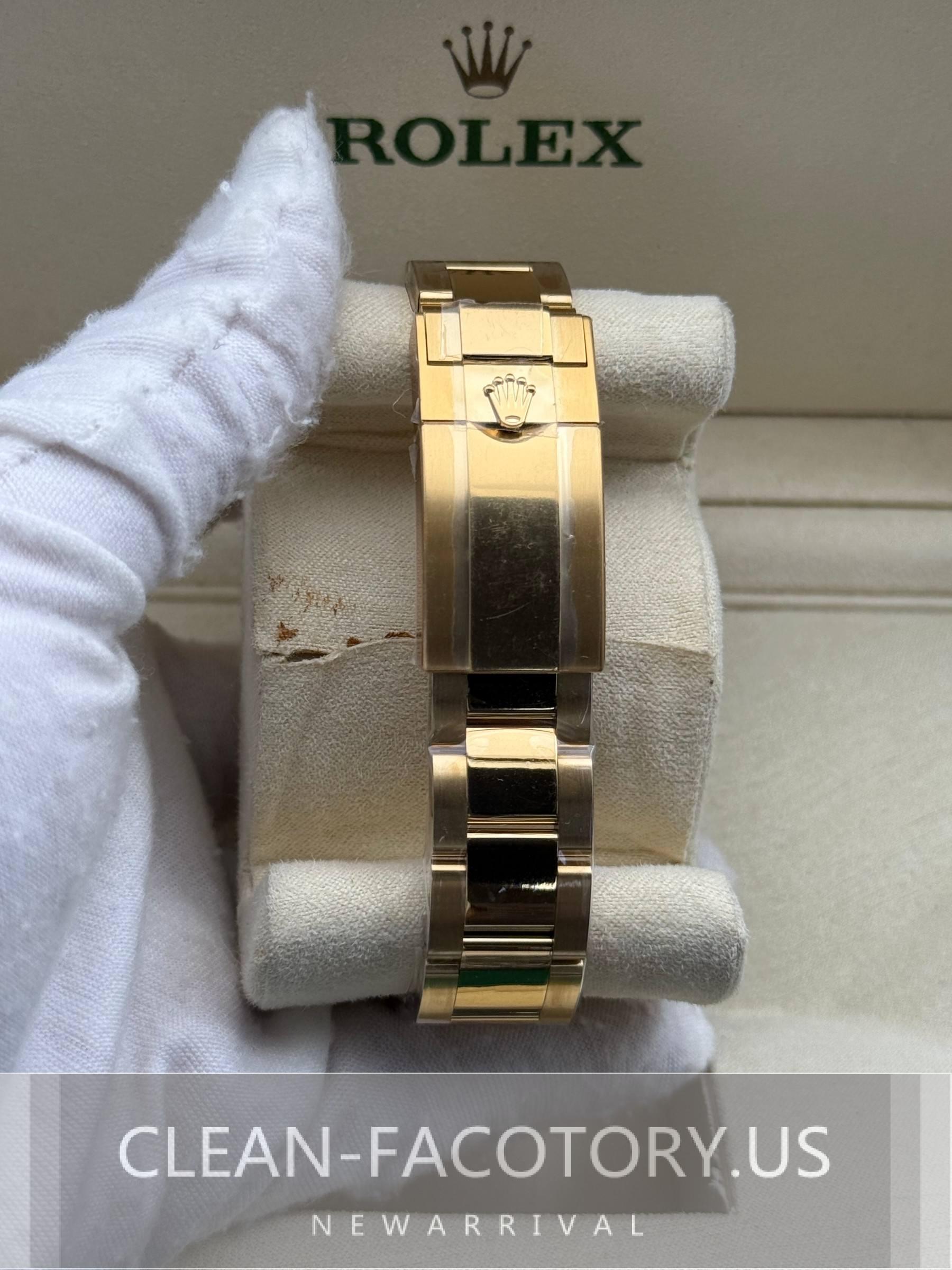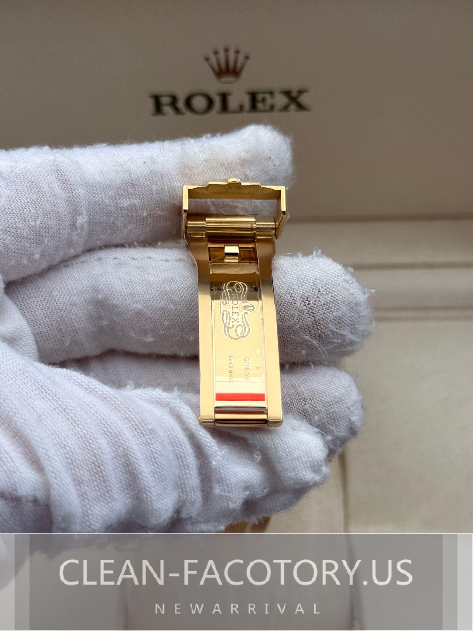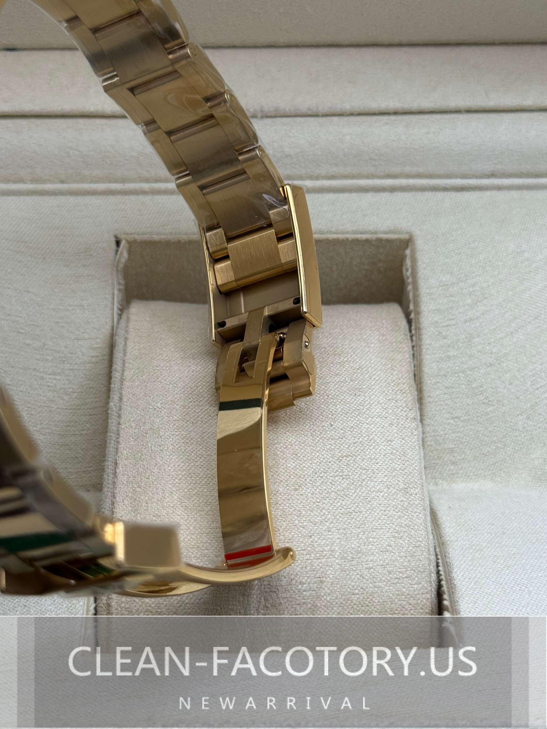 – **Bezel**: Clean Factory bezel is fixed, crafted from 18k Yellow gold wrap solid 904L stainless steel, with black coated numerals and graduations. This design is a perfect replica of the original Rolex.This bezel is polished to a high sheen, enhancing the watch’s overall elegance and sophisticated appearance.