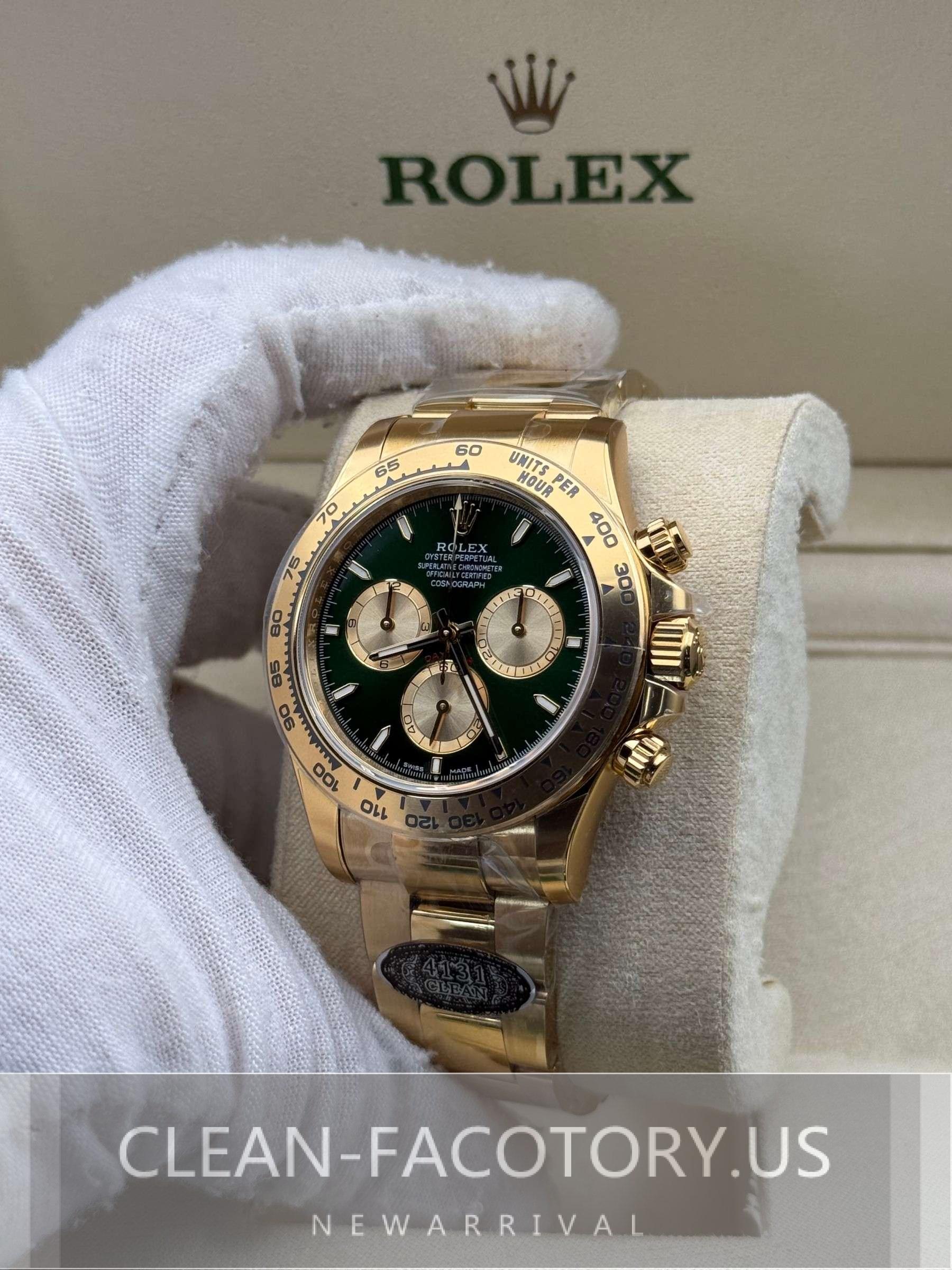 – **Dial**: Clean Factory has invested heavily to reproduce this signature hue, and the result is astonishingly close to the original. The green dial radiates the same vivid brilliance and elegance that collectors admire in the genuine piece. Each surface has been meticulously finished to mirror the authentic Rolex craftsmanship, with precise printing, flawless lume application, and perfect alignment of the sub-dials.Clean Factory guarantees laser precision in all text, prints, and engravings, making it indistinguishable from the genuine product. The 18k gold wrapped hour markers and hands add a touch of luxury while preventing tarnishing.