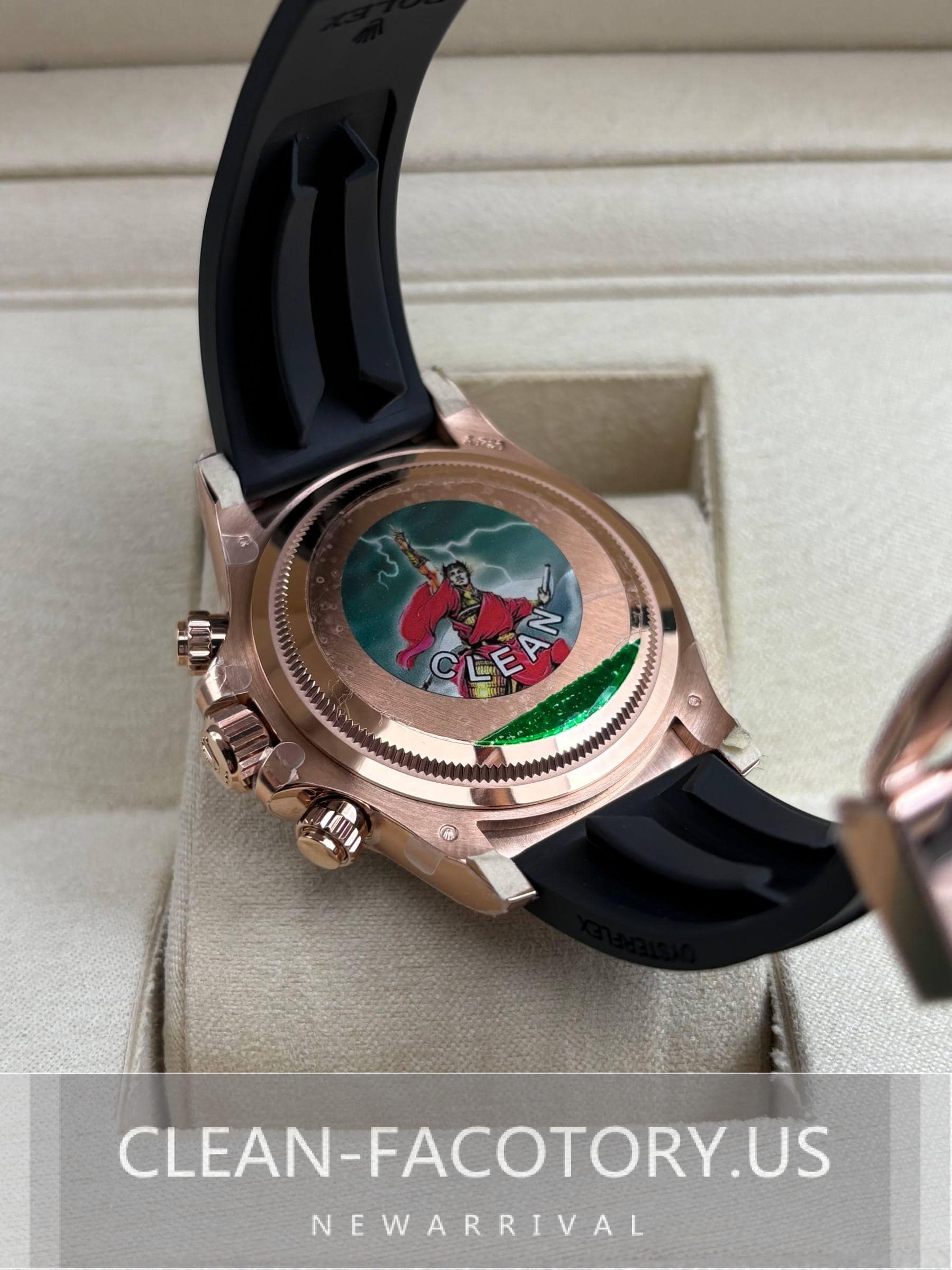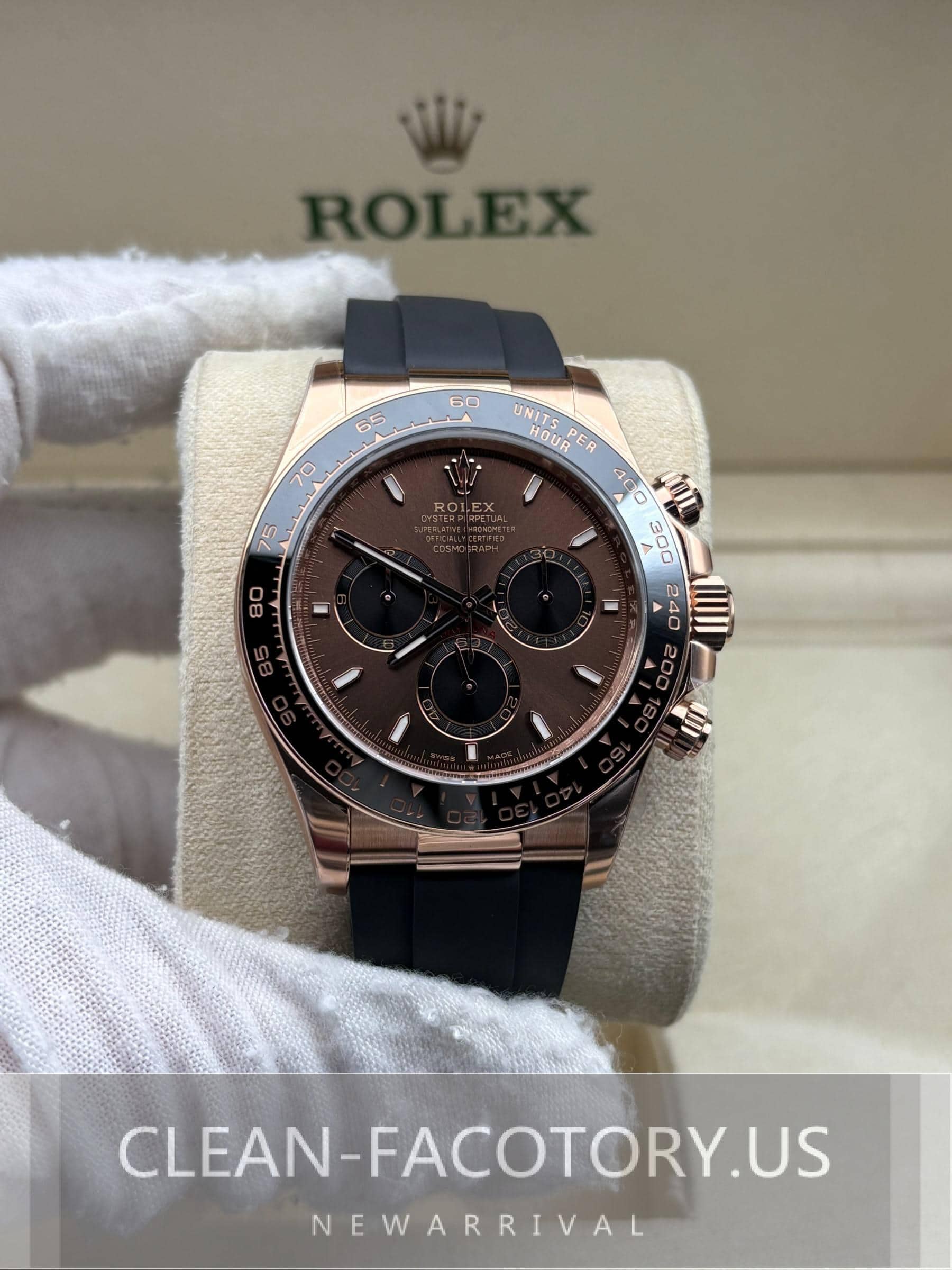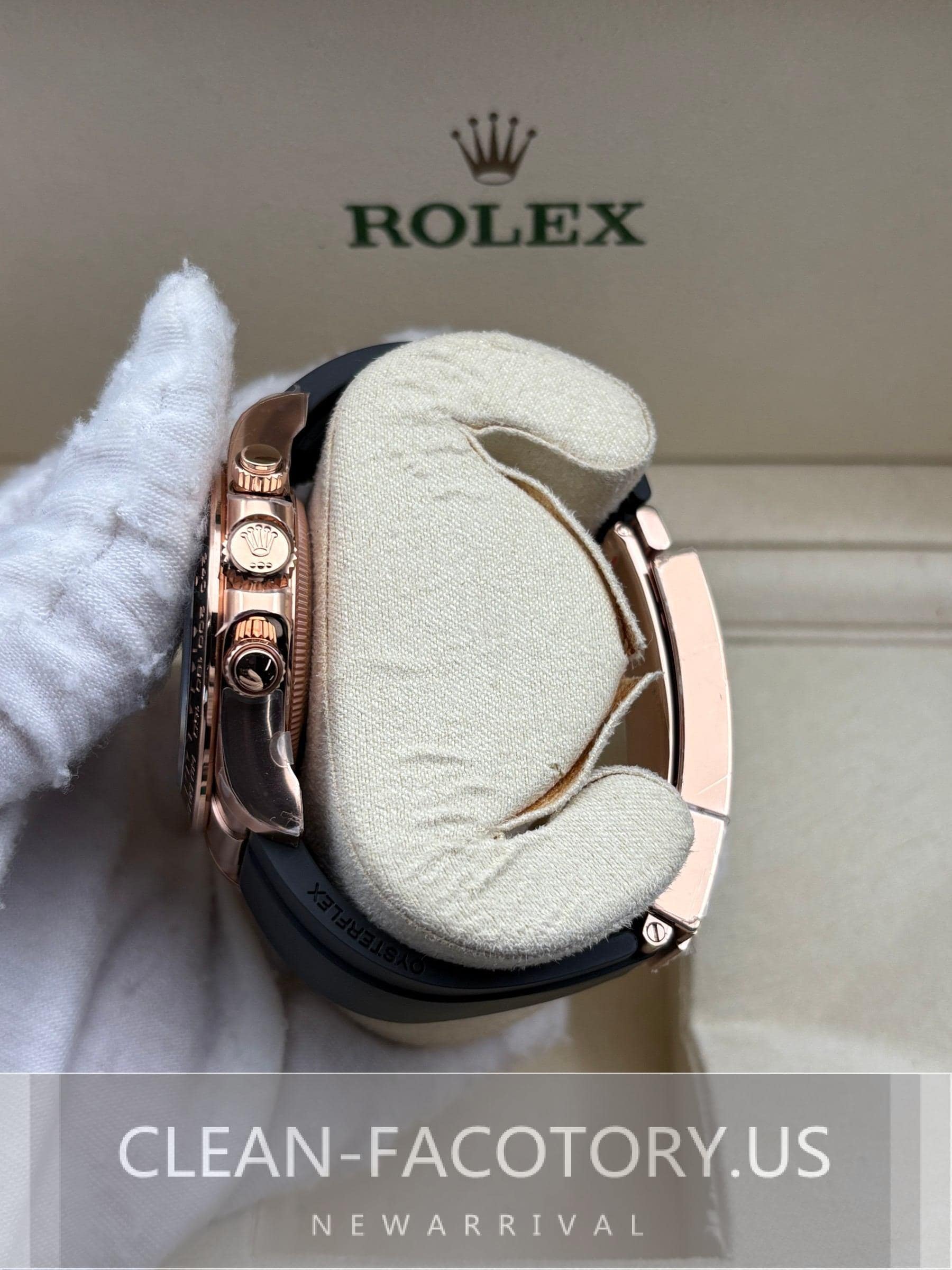 – **CASE**: The daytona watch made in Clean FACTORY is constructed from robust 904L stainless steel with a genuine 18k Rose gold PVD coating. The 40mm case size precisely matches the original. The case is crafted with a one-piece forged process, featuring smooth, refined edges. The solid, screw-down crown is integrated seamlessly with a Swiss rubber seal. The Rehaut is engraved with ‘ROLEXROLEX’, mirroring the authentic design in every aspect.