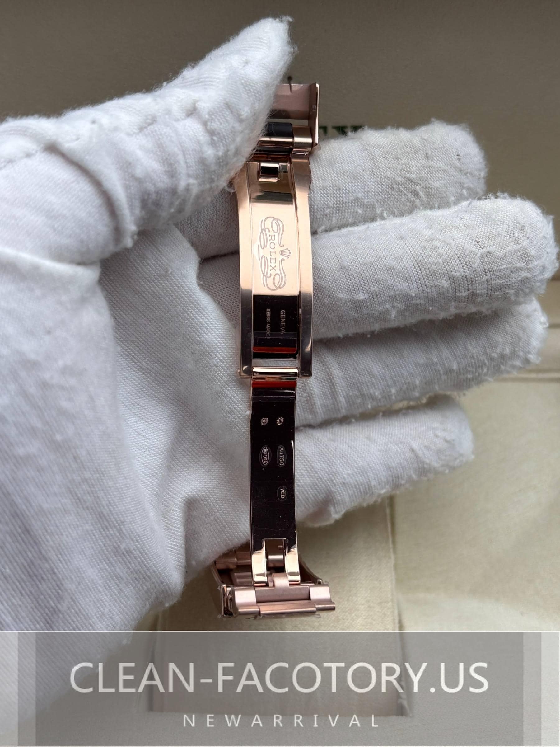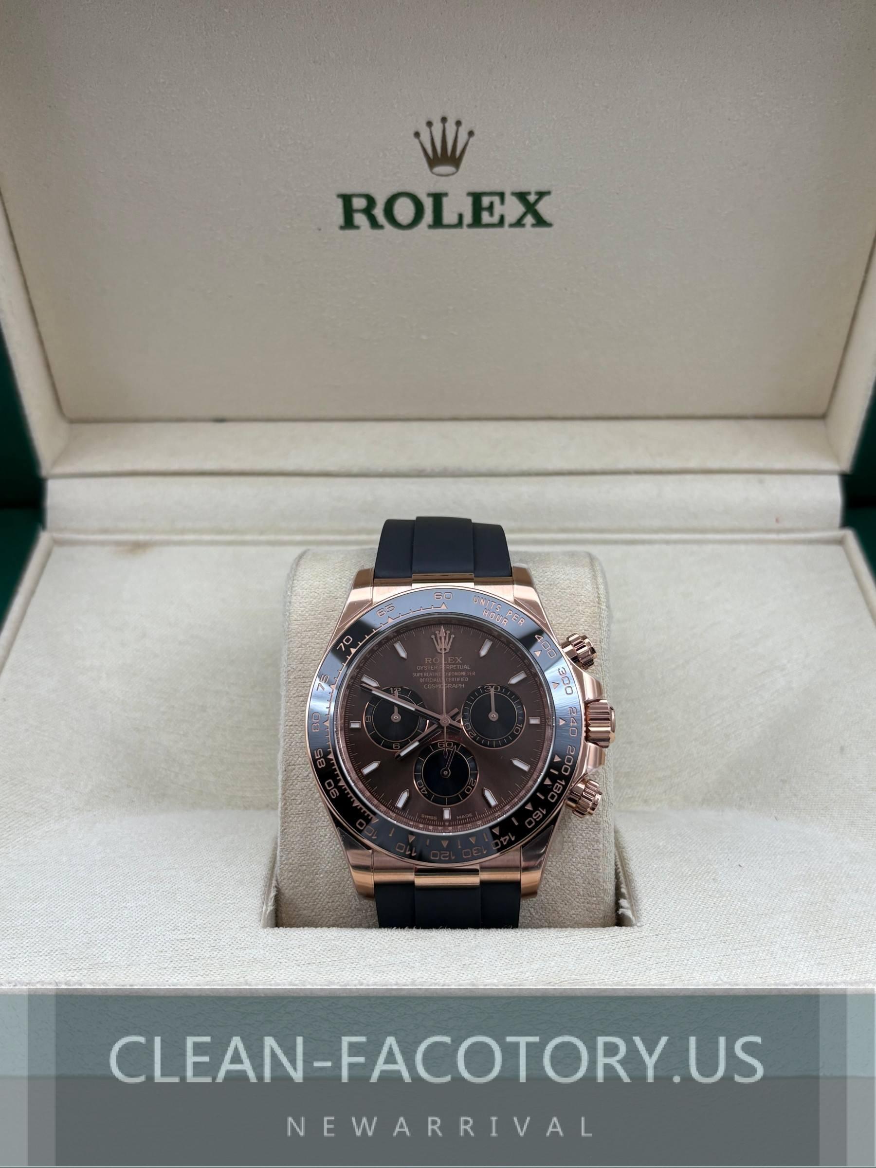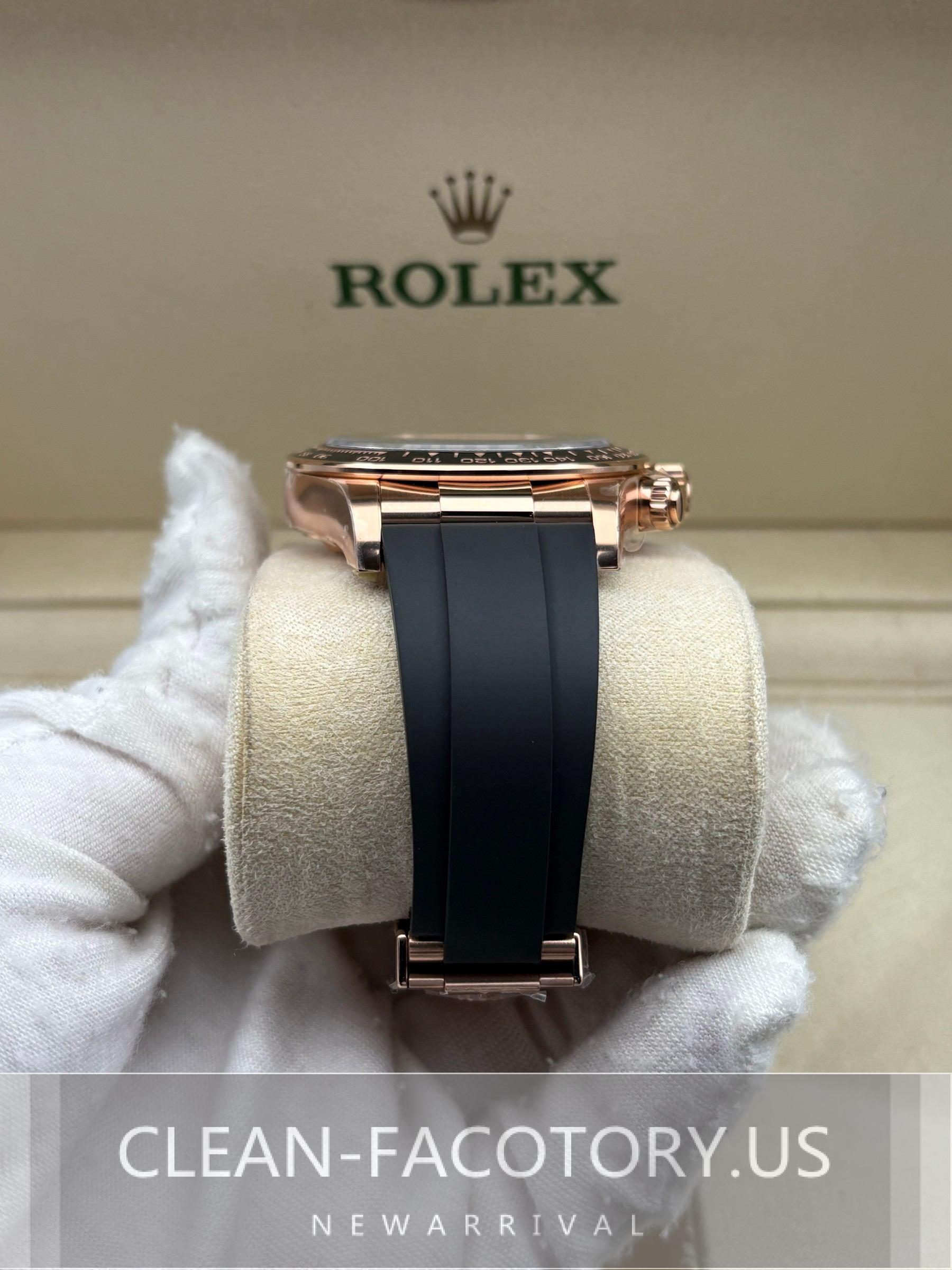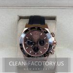 – **CASE**: The daytona watch made in Clean FACTORY is constructed from robust 904L stainless steel with a genuine 18k Rose gold PVD coating. The 40mm case size precisely matches the original. The case is crafted with a one-piece forged process, featuring smooth, refined edges. The solid, screw-down crown is integrated seamlessly with a Swiss rubber seal. The Rehaut is engraved with ‘ROLEXROLEX’, mirroring the authentic design in every aspect.