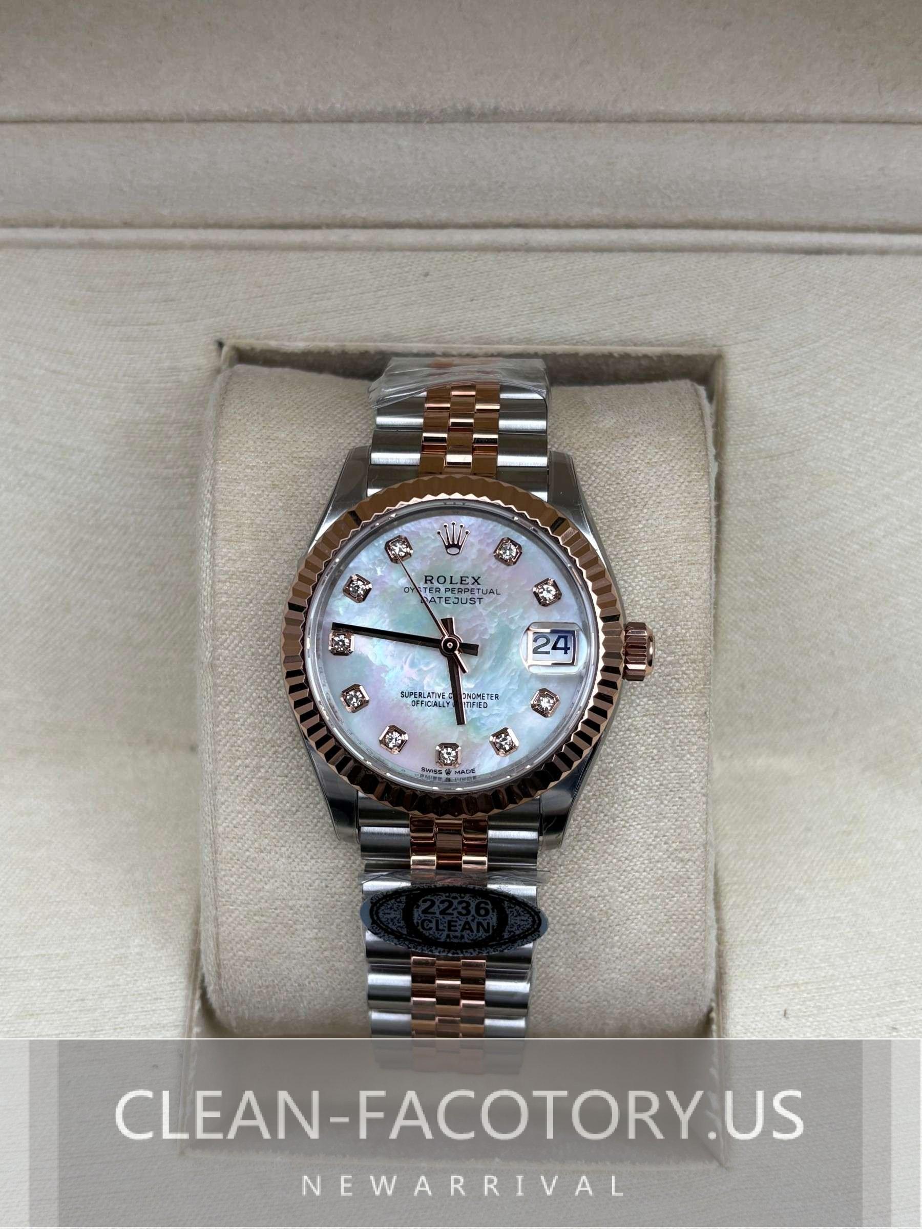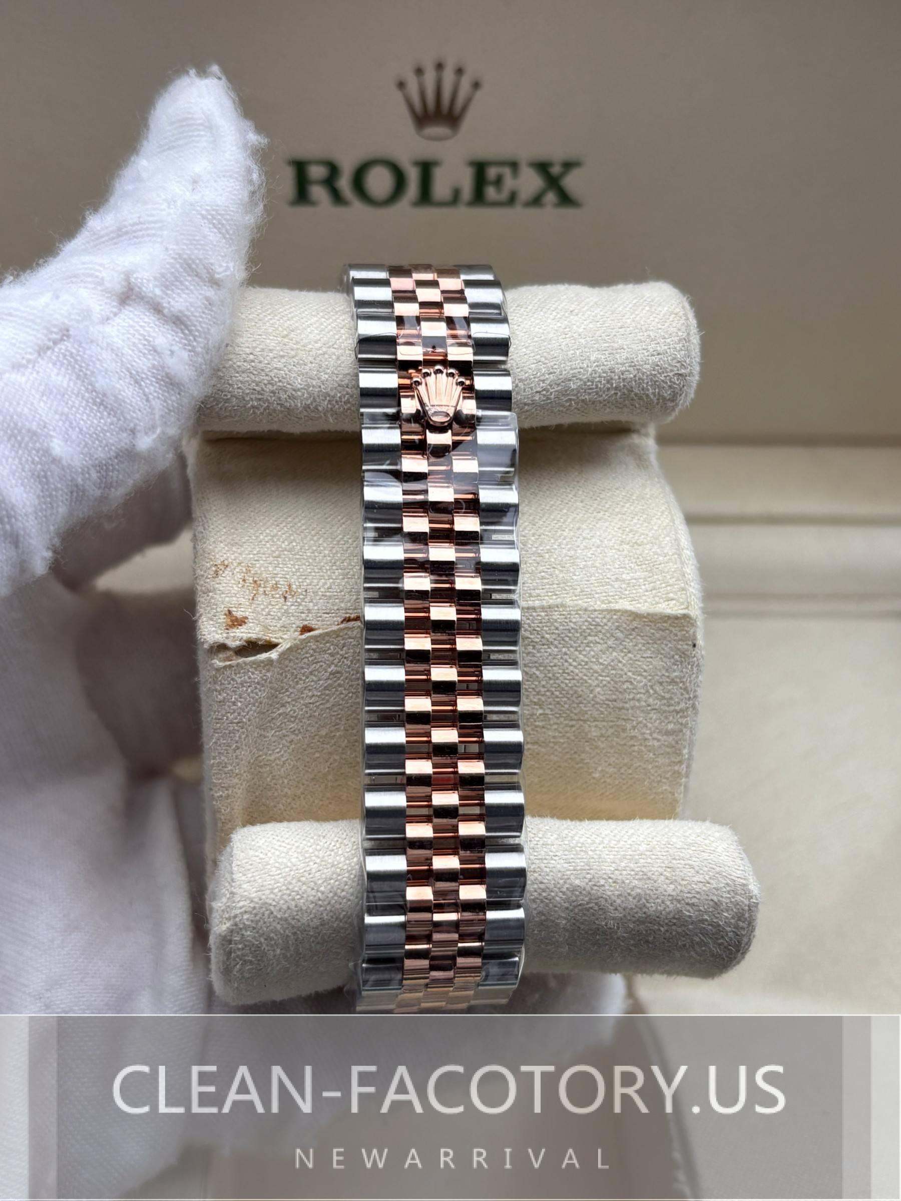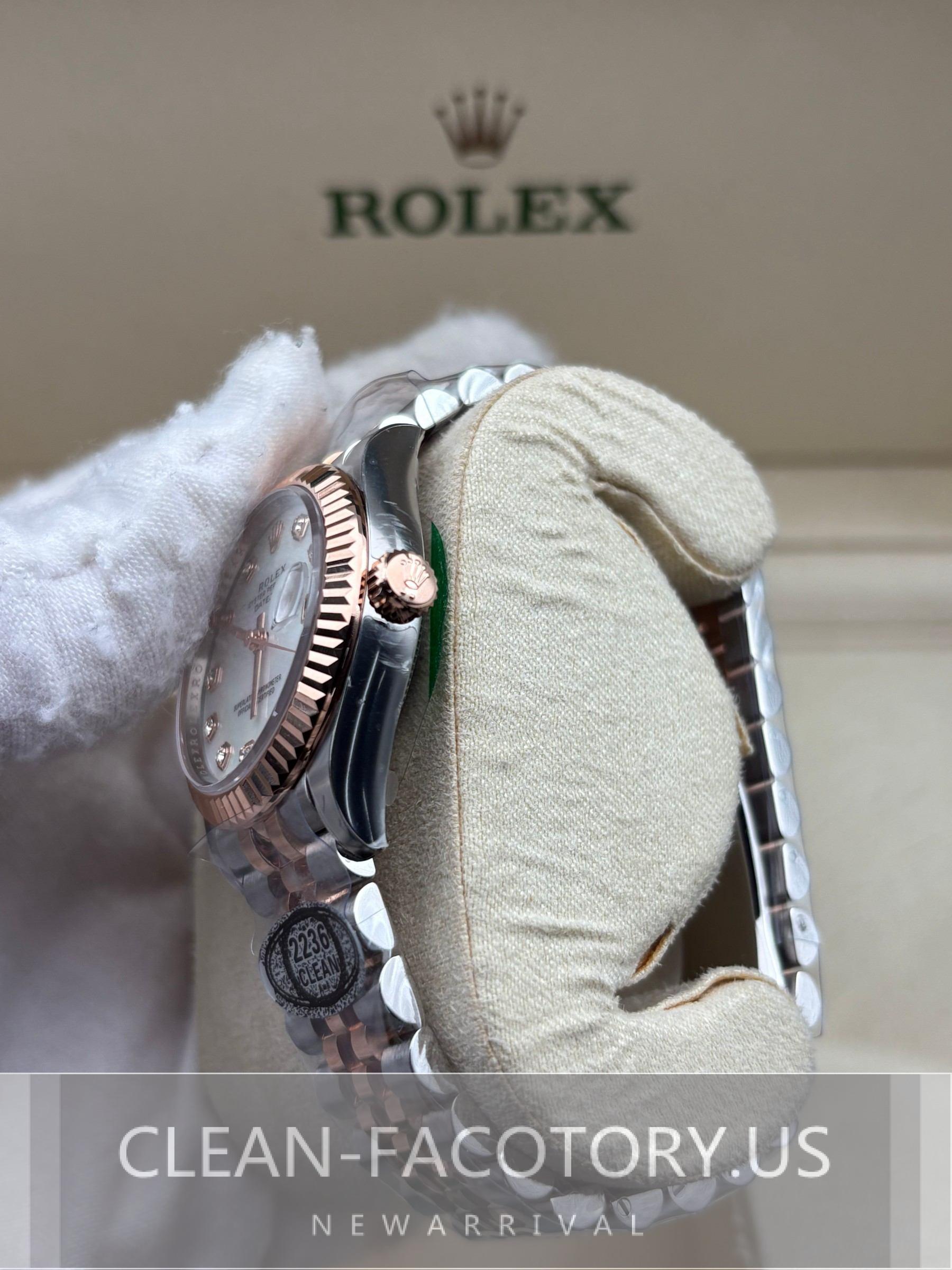 – **CASE**:Clean Factory proudly unveils the 31mm two-tone masterpiece, featuring a luxurious blend of 18k yellow gold wrapping and solid 904L stainless steel. The screw-down case-back and Twinlock double waterproof system, paired with a screw-down winding crown, ensure superior durability and functionality.Delicate yet resilient, the case is adorned with the iconic ROLEXROLEX laser engraving on the Rehaut ring, protected by a DLC scratch-resistant coating for lasting brilliance. Every detail, from dimensions to, has been meticulously matched to the genuine model, offering a flawless representation. Designed for modern women with refined taste, this timepiece guarantees compatibility, as all components are interchangeable with the original Rolex, embodying Clean Factory’s commitment to precision and timeless beauty.