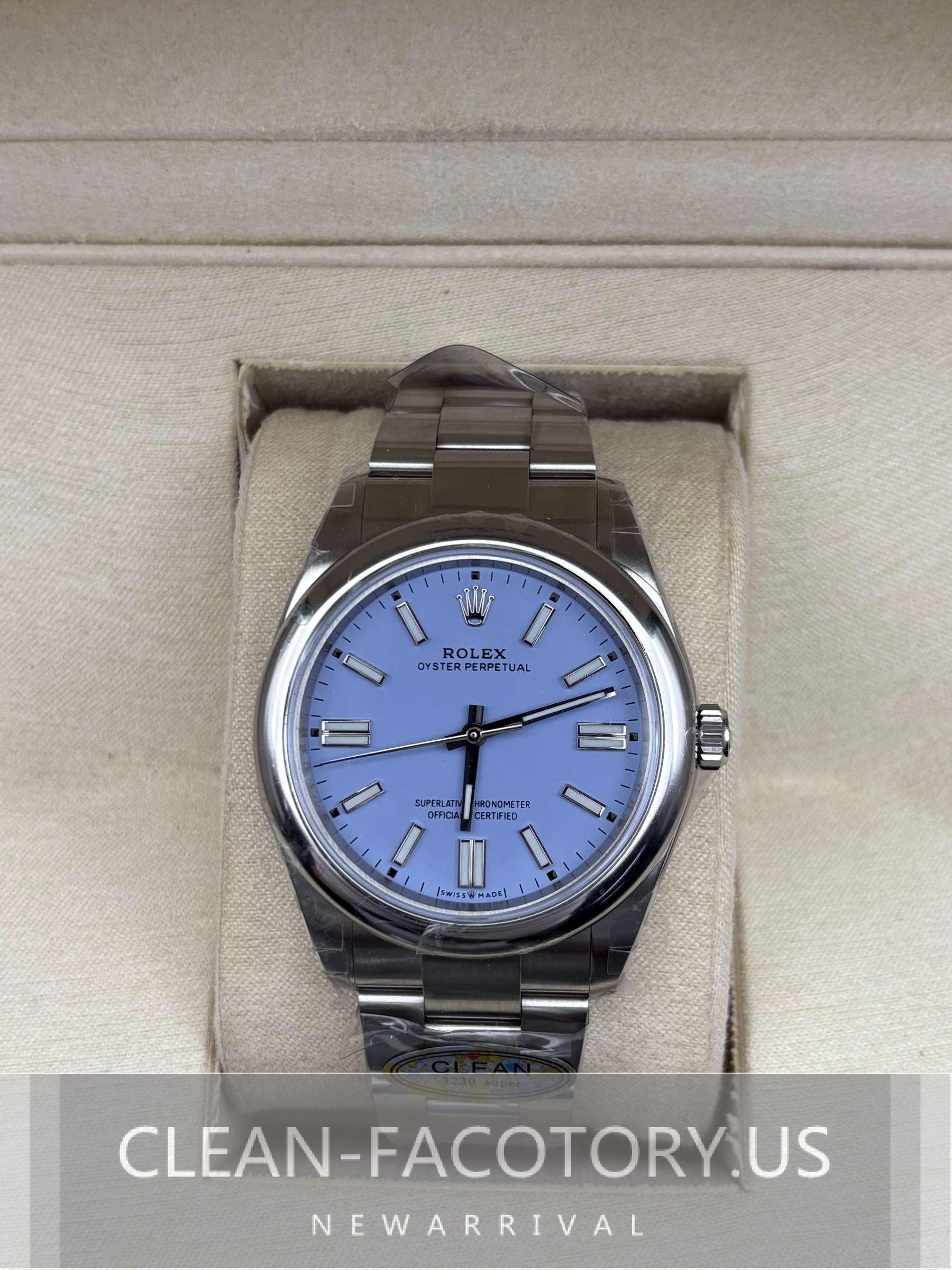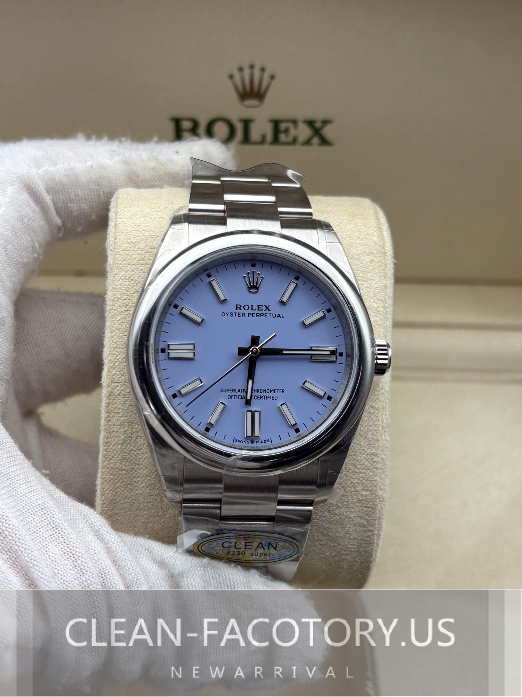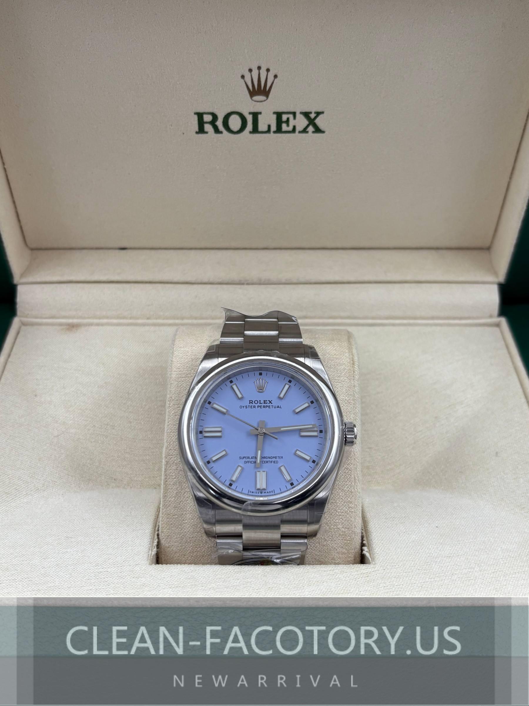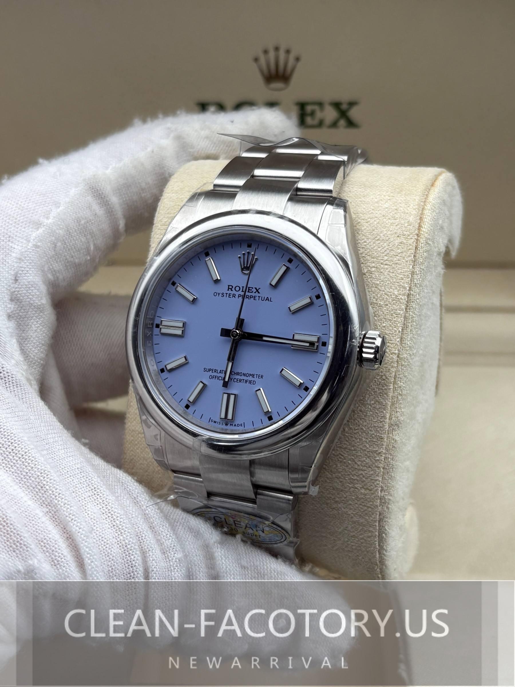 – **Dial**: Clean Factory Rolex Oyster Perpetual shown here stands out with its fresh Lavender Purple dial, a color that brings a modern and vibrant character to this classic collection. The smooth lacquer finish gives the dial a clean and refined appearance, while the baton-style hour markers and hands, coated with Chromalight luminescence, ensure excellent legibility in any lighting condition. The font size and legibility of the Chromalight display are precisely replicated in a 1:1 manner.