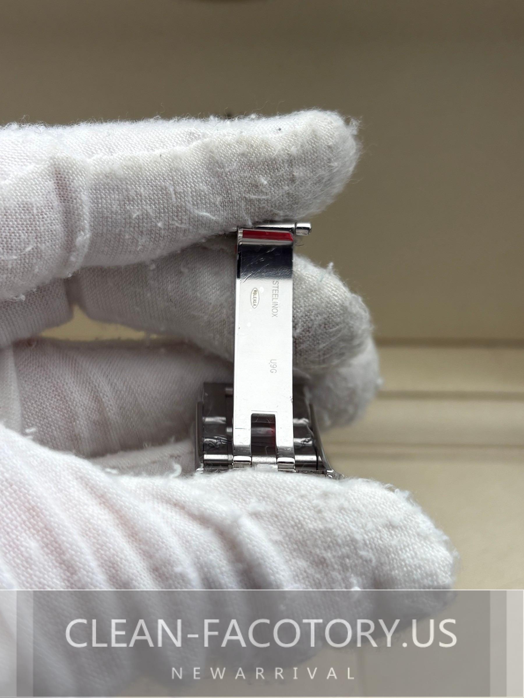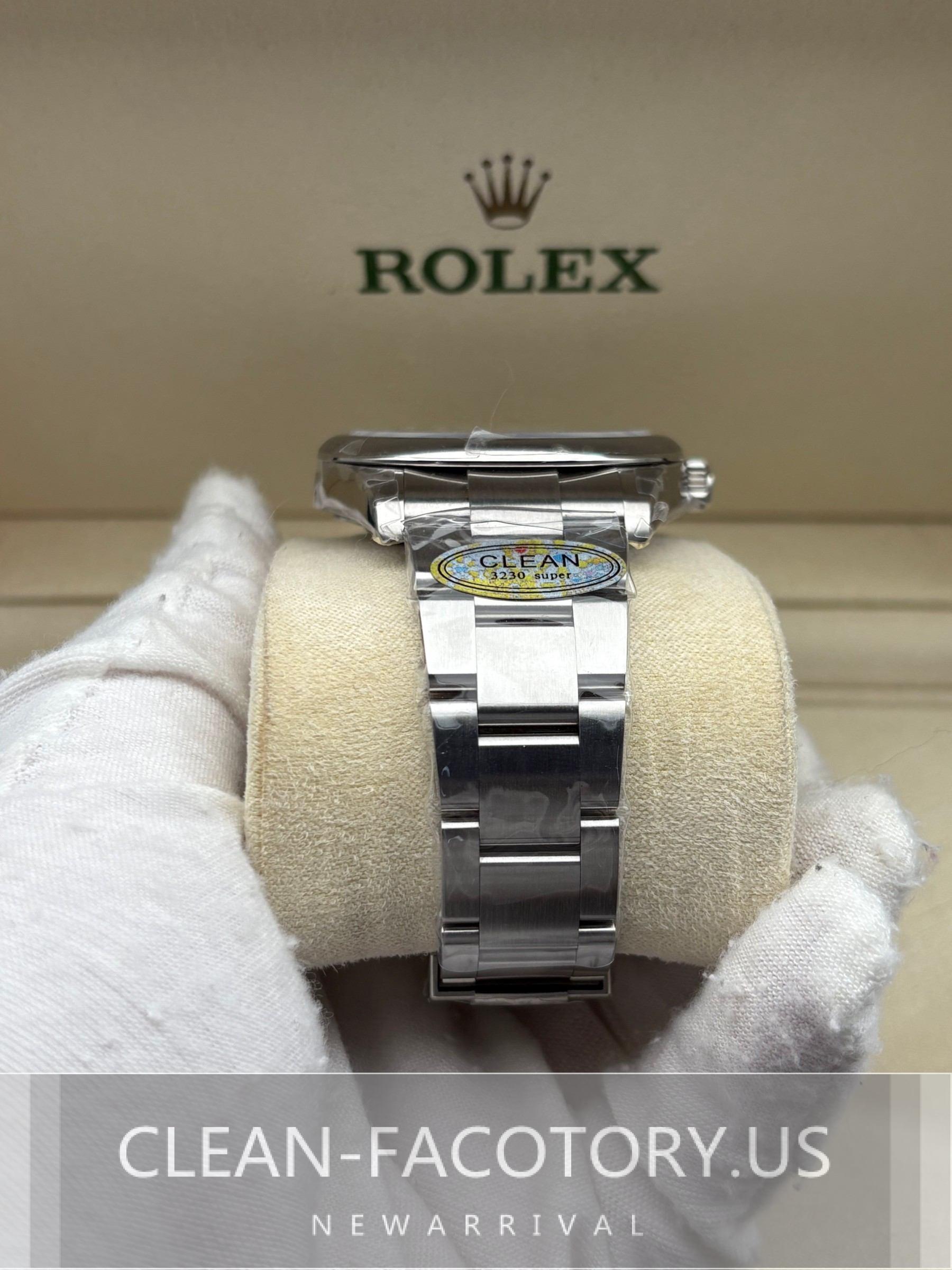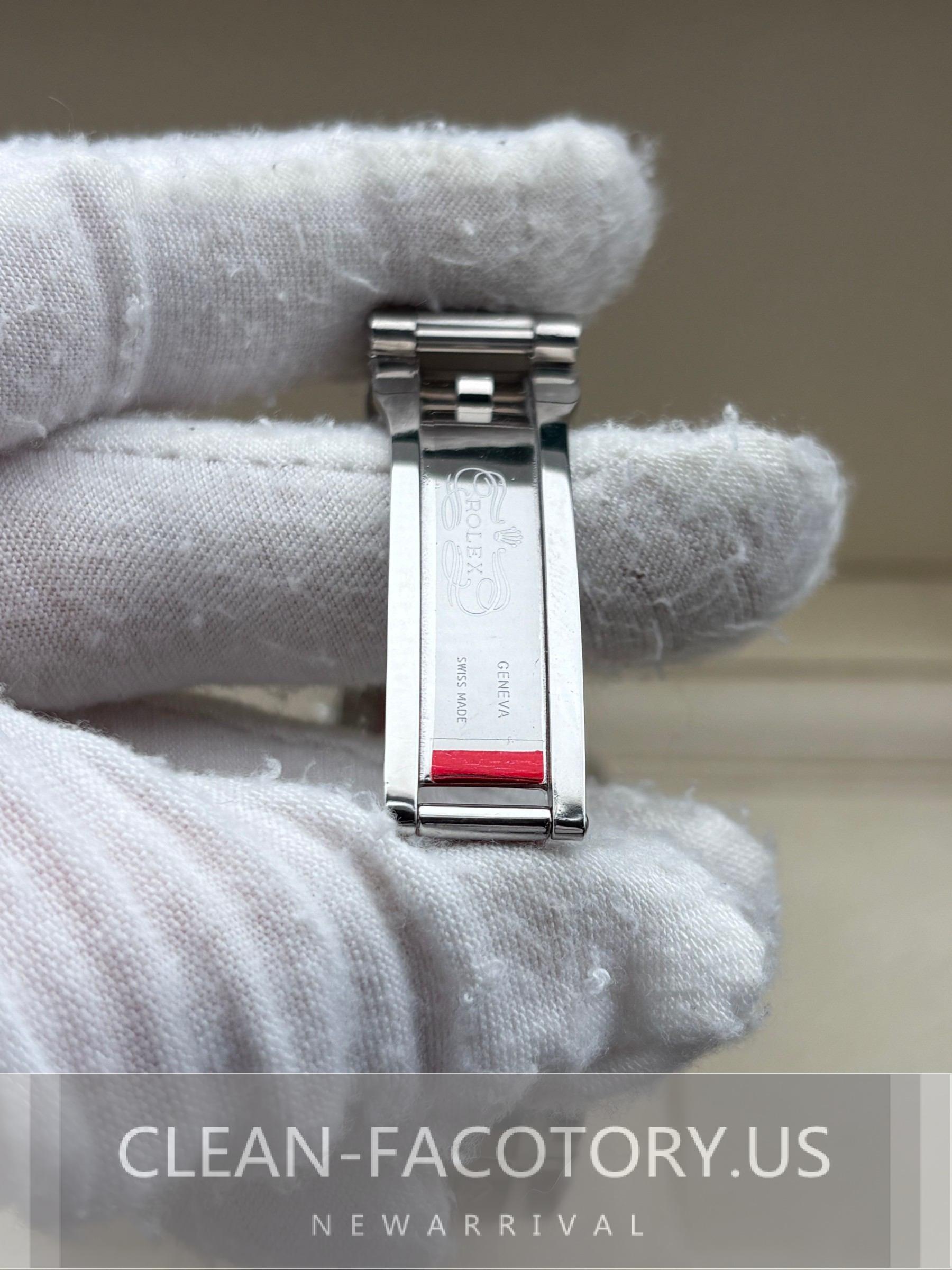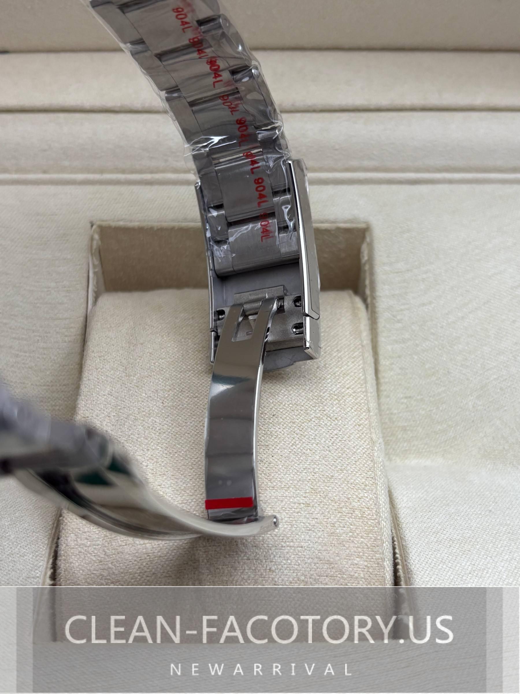 – **Bracelet**: Clean Factory’s design includes an Oyster bracelet with flat three-piece links, made from solid 904L Grade Stainless Steel and coated with a DLC scratch-protection coating. The bracelet features solid threaded screws, allowing for easy removal of bracelet links using a small screwdriver. The bracelet is equipped with a folding Oysterclasp, including an Easylink 5 mm comfort extension link, just like the original.