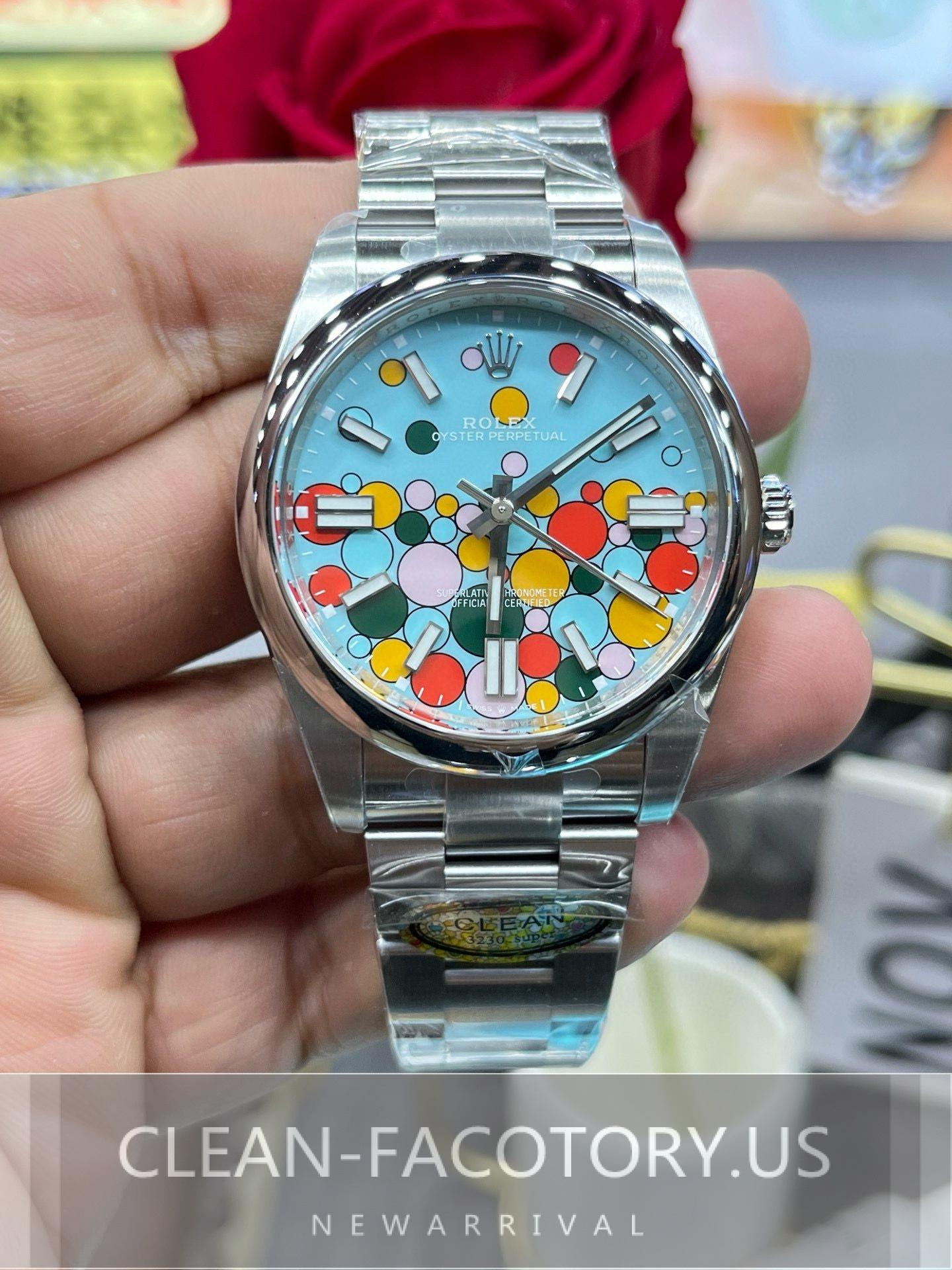 This time, Clean Factory has purchased a genuine Oyster Perpetual Celebration Dial 124300 (41mm) as a model for creating the Oyster Perpetual Celebration Dial replica. Since the colorways for the 126000 and 124300 are essentially the same, there are some slight differences in color placement between the two models. Comparison Between 126000 and the Replica When comparing the blue base color between the two models, the difference is almost negligible. The other colors, including the black edging, are also almost identical. There are no noticeable misalignments when observed with the naked eye. However, the only minor flaw I noticed is…