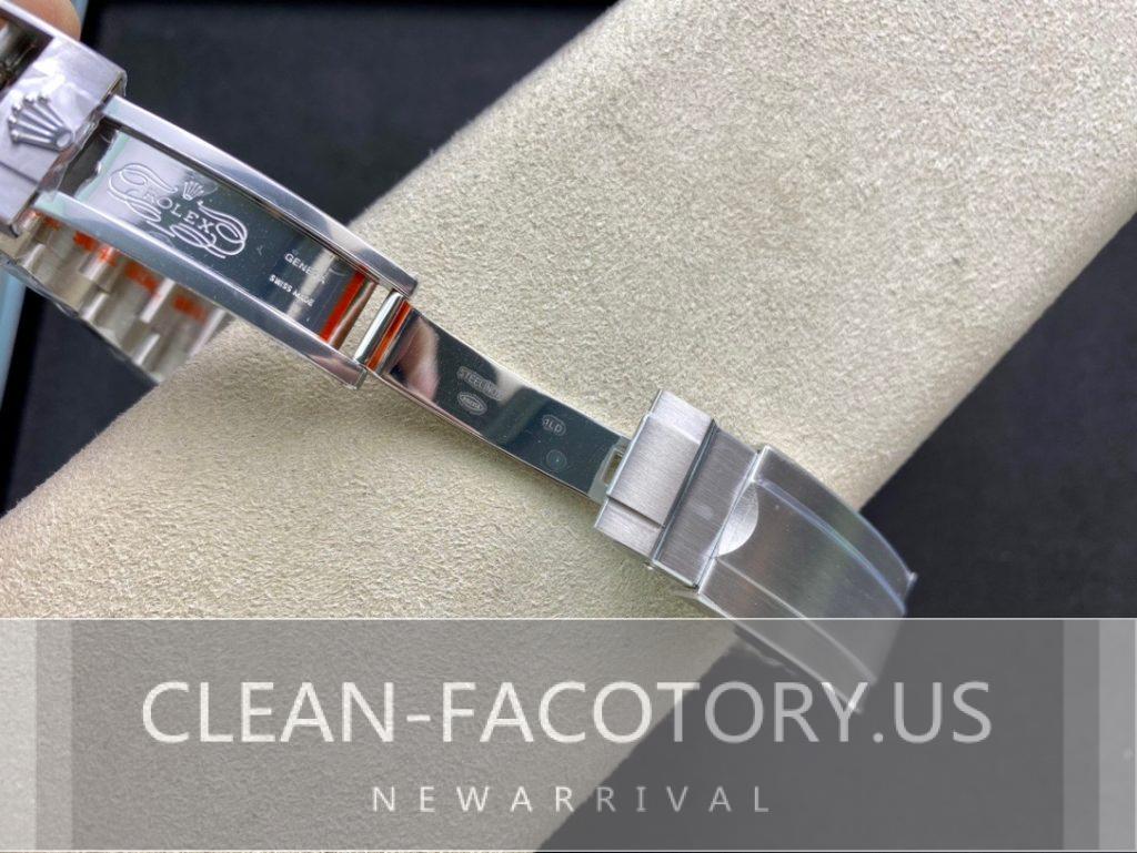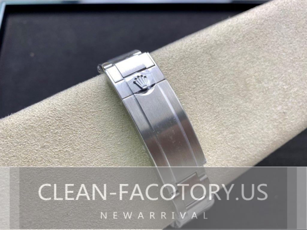 The classic Oyster case back is brushed to prevent wrist friction, encapsulating Clean Factory’s exclusive Cal.3130 automatic movement. This movement includes a blue Parachrom hairspring, ensuring top-notch accuracy and reliability. The bracelet is also constructed from the same high-grade steel as the case, with finishing that mirrors the original, complete with a folding clasp for ease of wear. The clasp’s logo is finely detailed, smooth, and free from any roughness.