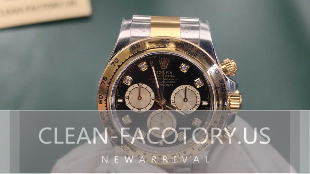 The black diamond Daytona is a finishing and engineering stress test. A glossy black lacquered surface, diamond markers, sunray sub-dials, and reflective gold elements together form a configuration that exposes every flaw. Clean Factory’s execution succeeds because: